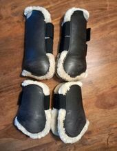Hartschalengamaschen sowie dazu passende lange Streichkappen der Marke Eskadron, flexisoft, by Ludger Beerbaum, in der Größe WB. Die Farbe ist Dunkelbraun, fast Schwarz. Alle mit schönem weichen Fell ausgestattet.