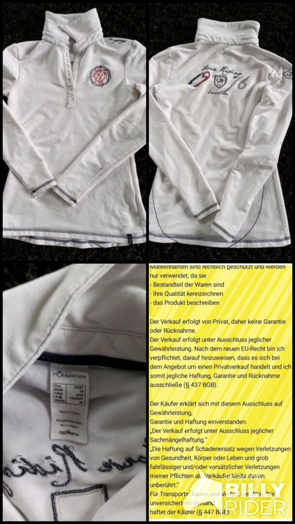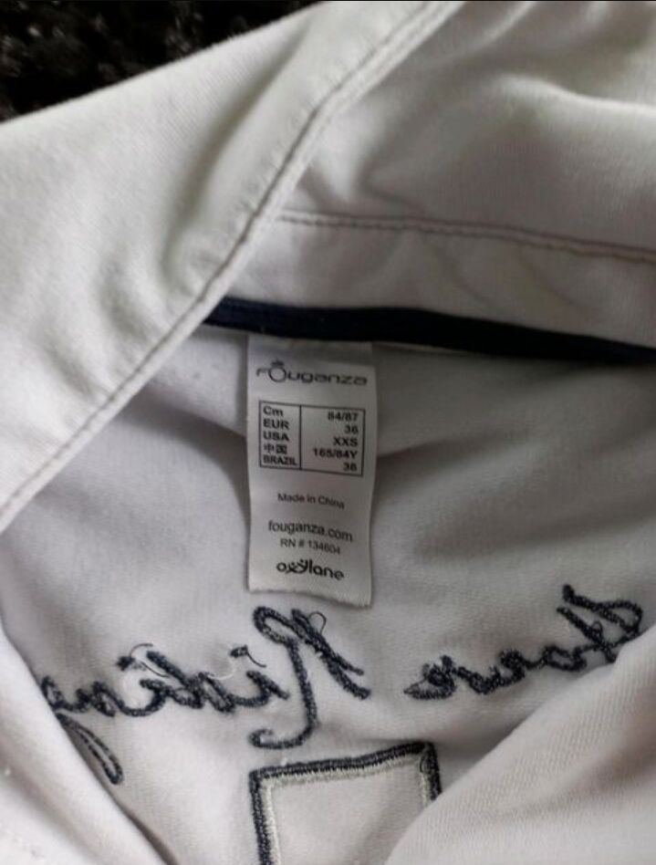 Weißes Trainingsshirt mit Applikationen der Marke Fouganza in der Größe XXS bzw. D34 - D36. Sehr strechiges Material. Das Shirt befindet sich in einem guten, gebrauchten Zustand.