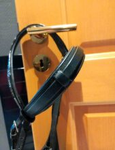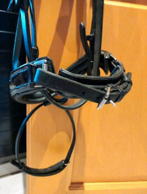 Tolle, gepflegte Trense der Marke My Filou mit glitzerndem Stirn- und Nasenriemen. Farbe: Schwarz. Genickstück als auch Nasenriemen schön weich gepolstert. Beschläge in Silber. Ohne Zügel und Gebiss! NP lag bei 180 €.