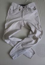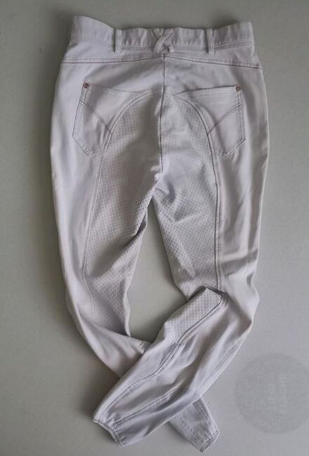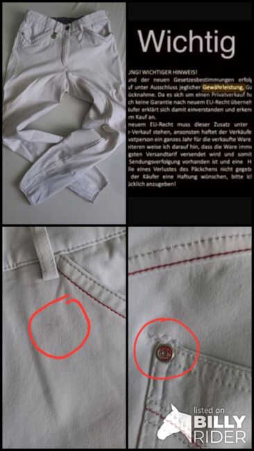 Gut erhaltene Turnierreithose der Marke Pikeur, Modell Patricia Fullgrip, in der Größe D36. Passt auch Kindern mit der Konfektionsgröße 176. Farbe: Weiß, rote Ziernähte. Der Grip ist tadellos. Wo gehobelt wird fallen Späne: Hose hat leichte Verfärbungen am Gesäß und an den Beinen vom Sattelleder. Außerdem gab's ein klitzekleines Loch an der Niete der linken Gesäßtasche (Foto), das genäht wurde. Kurz unterhalb des Bundes befindet sich an der linken Seite ein klitzekleiner, blasser, kaum sichtbarer Fleck (Foto). NP lag bei 140 €.