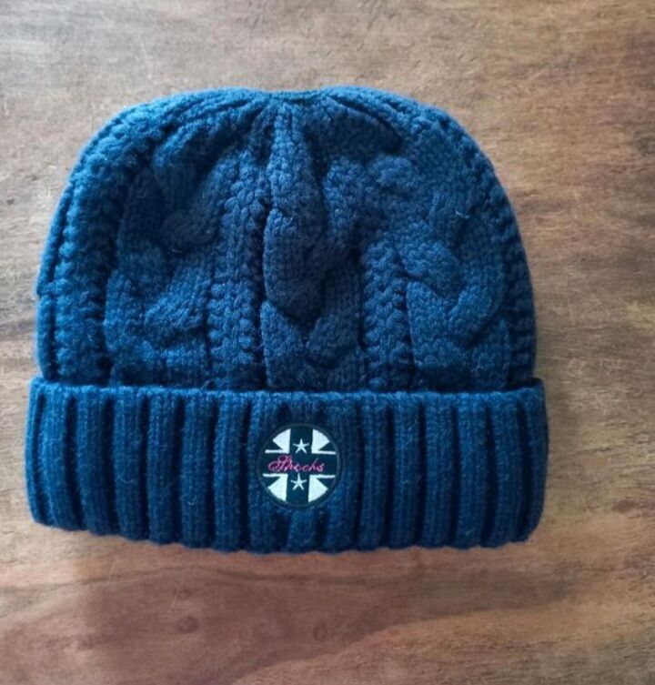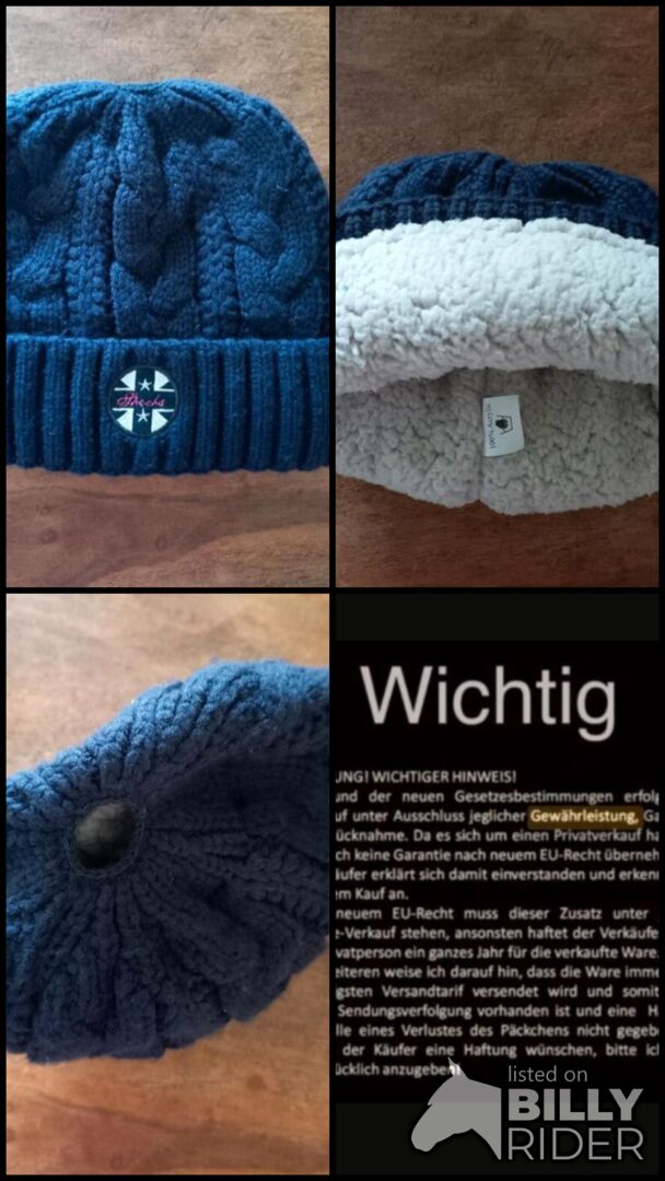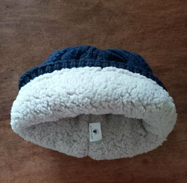 Navy Strickmütze der Marke Spooks, kuschelig warm gefüttert. Einheitsgröße. Mit Öffnung oben, so dass man bei Bedarf seinen Haarzopf durchführen kann. Sehr guter, gebrauchter Zustand.