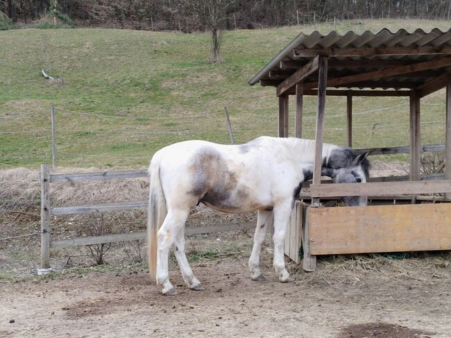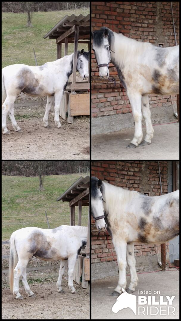 Mutter Lipizzanermix, Vater Waterman, Porzellanschecke, 3,5 Jahre alt, Stockmaß ca. 160 cm, barocker Typ. Kein kinder- oder Anfängerpferd. Roh.