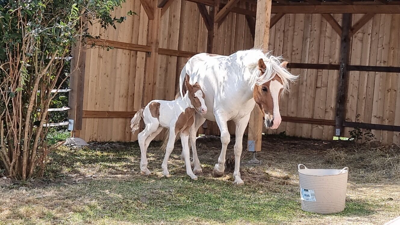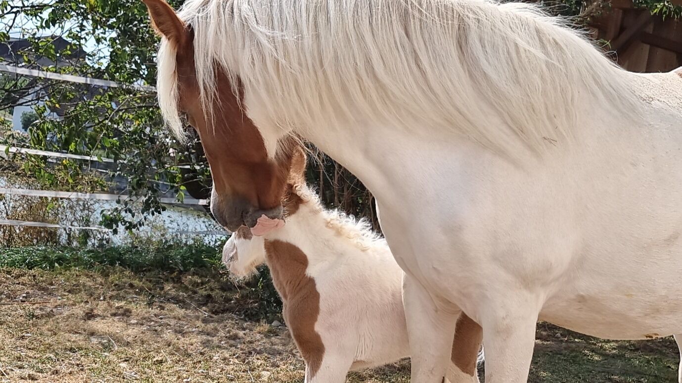 Bildhübsche, sehr große (ca. 150cm) Stute mit entzückendem, großen, am 4.9.2024 geborenen Stutfohlen bei Fuß.