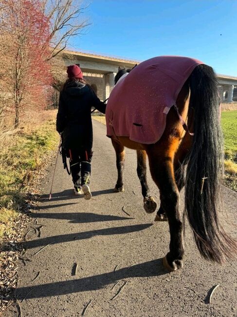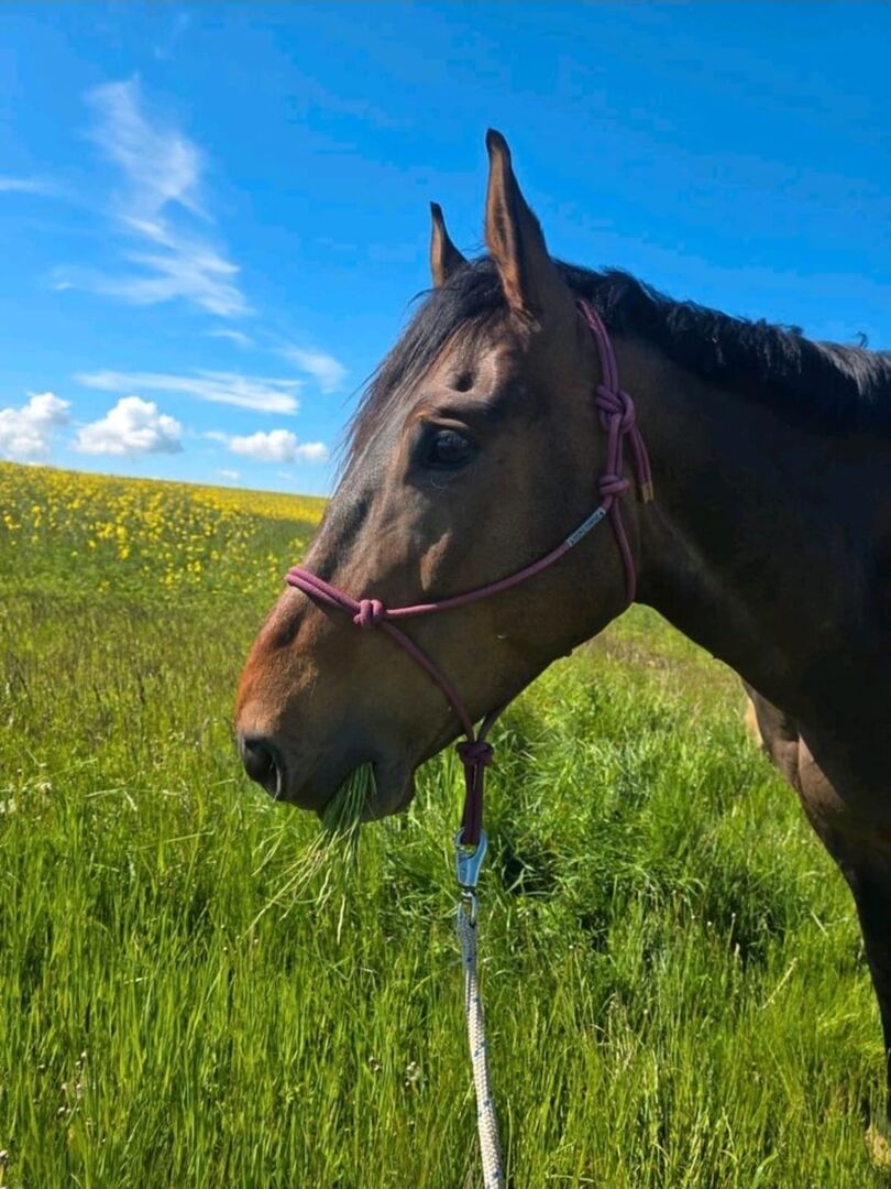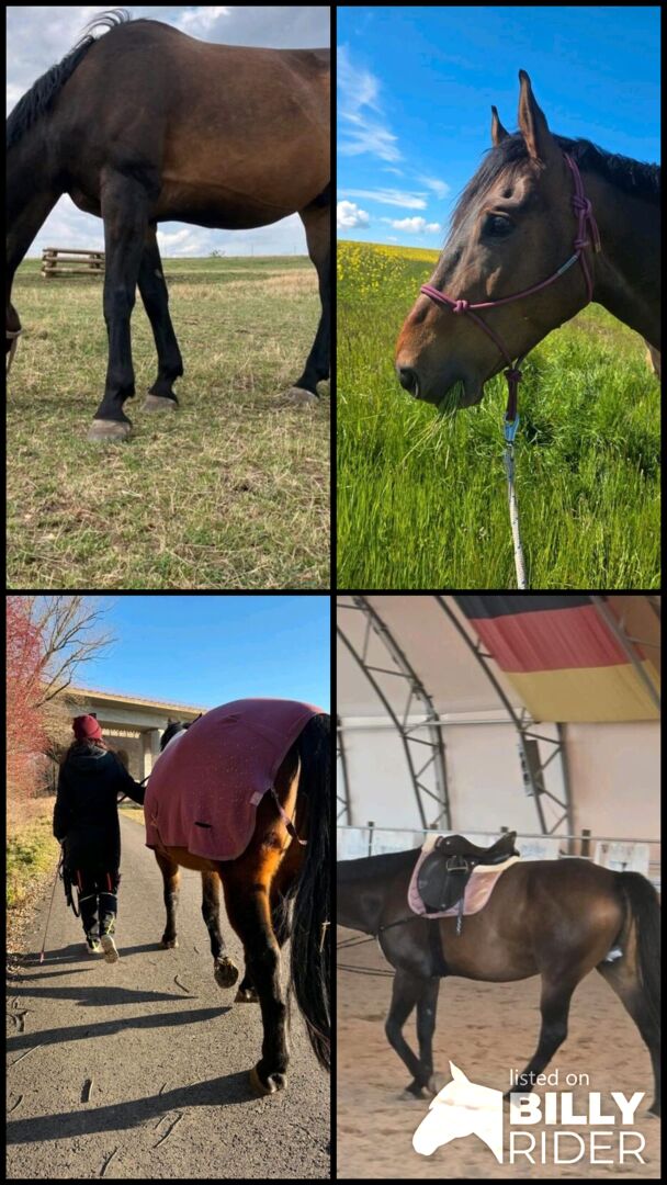 8 jähriger Wallach, dt. Sportpferd, Stockmaß ca 1,70 m, mit großem Herzen ♥️ Sucht neuen Wirkungskreis… Spirit ist ein Jungspund, der leicht angeritten ist. Er kennt Schritt und Trab unter dem Reiter, sowohl an der Longe als auch frei im Roundpen. Bedingt durch eine Schwangerschaft saß ich im März zuletzt auf ihm. Reiterlich zeigte er bisher keinerlei Unarten. Aktuell wurde er wenig bis gar nicht gearbeitet. Es bedarf also etwas Muskelaufbau, bevor sich wieder ein Reiter auf ihn setzen kann. Spirit möchte gern gefallen und ist ein lern- und arbeitswilliges Pferd. Er ist Dressur gezogen, hat aber auch Spaß am Springen (muss jedoch wieder heran geführt werden -> Freispringen, bisher nie mit Reiter) Spirit läuft barhuf und wurde regelmäßig beim Schmied vorgestellt. Verladen ist nicht unbedingt seine Lieblingsdisziplin, was jedoch eher an mangelnder Lust seinerseits liegt, statt an Angst. Spirit sollte nicht mit Stuten zusammen stehen.