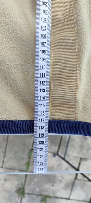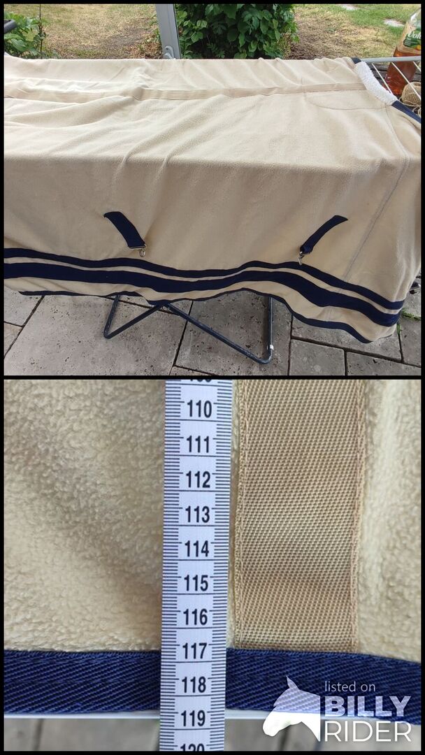 Abschwitzdecke mit Kreuzgurten. Leider steht nirgends die Größe von der Decke, aber ich habe sie mit einem Zollstock ausgemessen. Die Länge dort beträgt 118 - 119 cm.