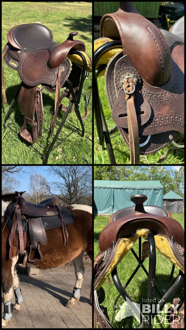 Westernsattel für lange Ritte. Diese Generation von einem baumlosen Sattel bietet durch den Spritzguss-Schaum-Aufbau eine sehr breite Auflagefläche mit einer guten Gewichtsverteilung auf dem Pferderücken. Der Reiter hat einen tiefen Sitz ähnlich wie in einem 'normalen' Westernsattel. Mit Borderline Punzierung und Round Skirt. Für breite, kurze Pferde - Sattellänge ca. 60 cm. Besonderheit: Die Fender werden durch einen T-Buckle aus Edelstahl befestigt. Dadurch können die Fender in verschiedenen Höhen eingestellt werden. Fork auswechselbar! Der Sattel wird mit Fork Gr. 5 ( 27,5 cm, X-Full, empfohlen für breite Haflinger u. Ä.) geliefert. - belastbar bis max. 100 kg - Sitzgröße: ca. 40 cm / 16"