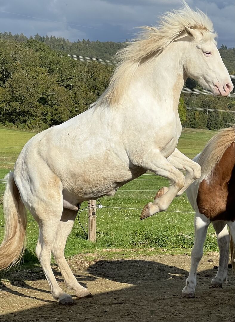Dieser außergewöhnliche Wallach ist F1, klassisch zu je 50% Paso Peruano x Islandpferd gezogen mit Sonderfarbe Palomino-Schecke, ein blaues und ein braunes Auge.