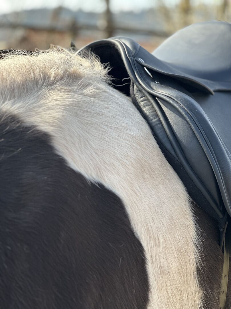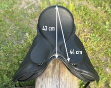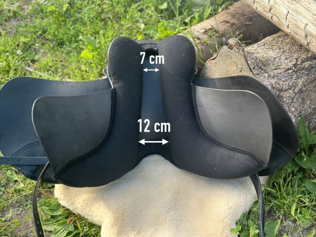 Kurzer bequemer Allroundsattel für Freizeit / Dressur & Tölt — passt auf runde Pferde mit wenig Widerrist, gerader bis leicht geschwungener Rücken. 17” Sitz — Auflage ca. 40 cm (Gesamtlänge 43 cm) — KW 34 — breiter Wirbelkanal (Maße siehe Fotos). Versand auf Probe (versichert mit DHL-Sendungsnummer).