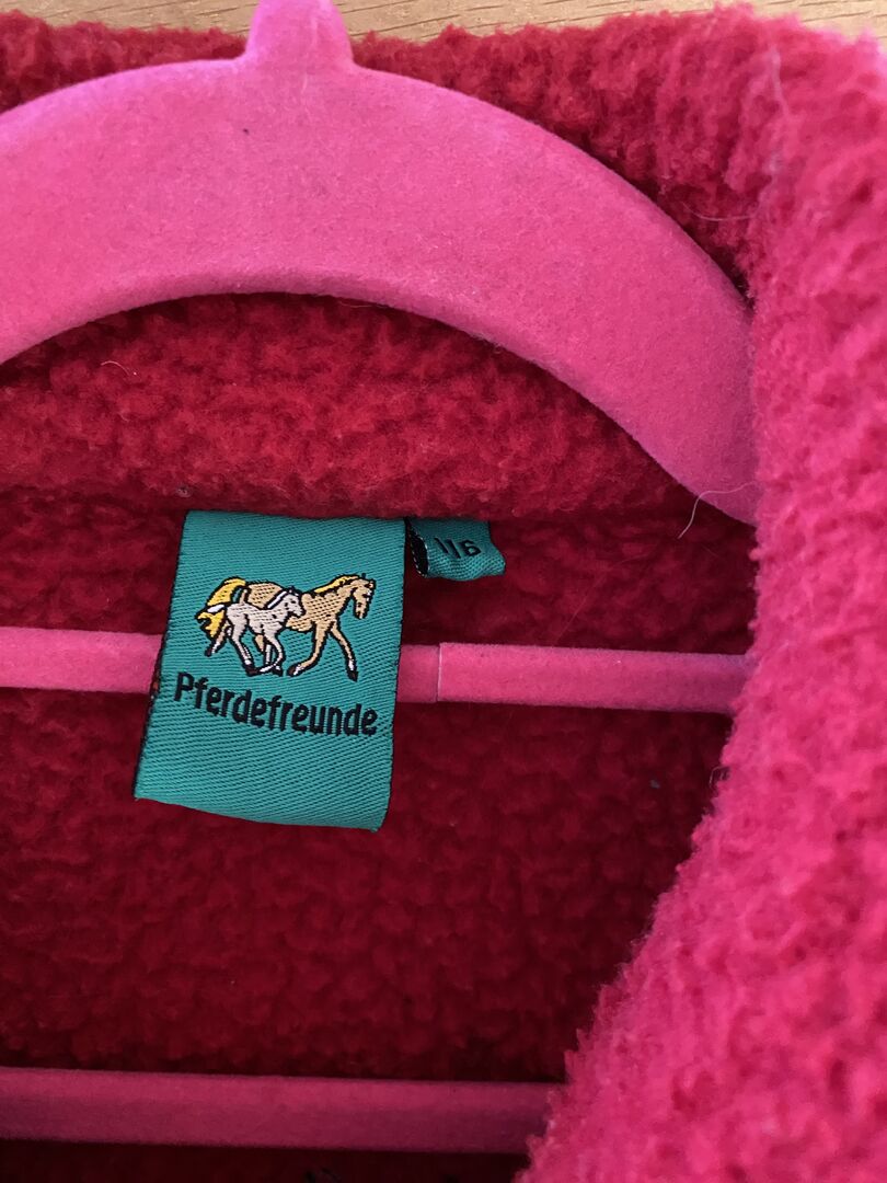 Warme altrosafarbene Teddyjacke inGrösse 116 mit.Vorderreissverschluss, über Gummiband einstellbarer Bund, auf dem Rücken Pferdelogo. Vorne zwei Reissverschlusstaschen