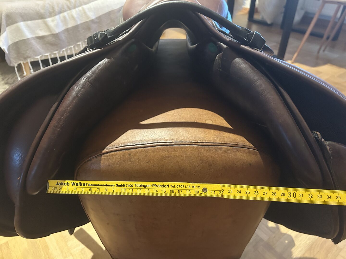 Springsattel der Marke Amerigo. Der Sattel ist in einem sehr guten Zustand, wurde immer gepflegt und regelmäßig vom Sattler gecheckt. Die Kammerweite ist etwas weiter, Amerigo gibt das mit +2,5 an. Er lag auf einem 1,75 großen, mittelkräftigen Warmblut.