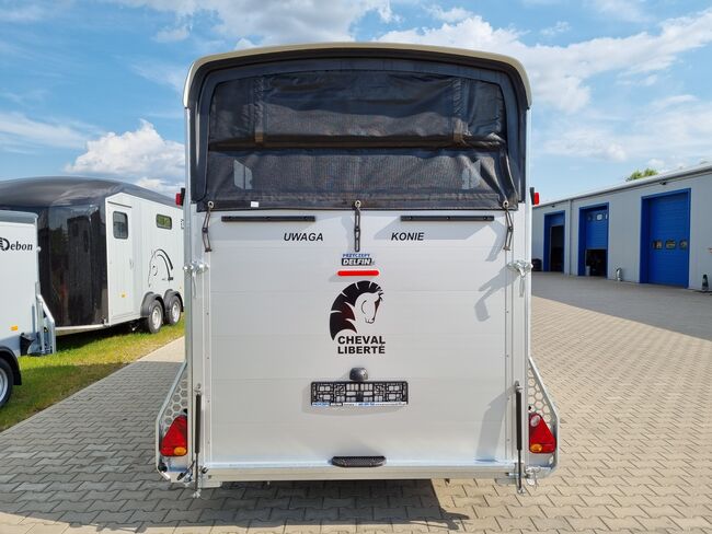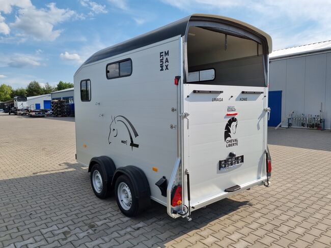Anhänger Cheval Liberté Multimax mit großer Sattelkammer und flexibler Konfiguration - Doppelanhänger für Pferde mit Aluminiumrahmen, extra breiter Sattelkammer, gelenkiger Mitteltrennwand, Pullman II-Federung und verstärktem Polyesterdach. Ideal für einen bequemen, sicheren und praktischen Transport über alle Entfernungen.