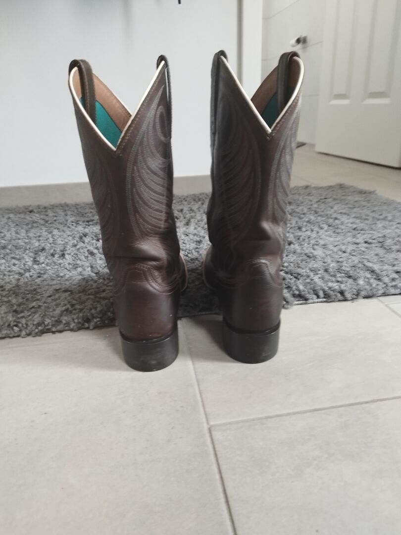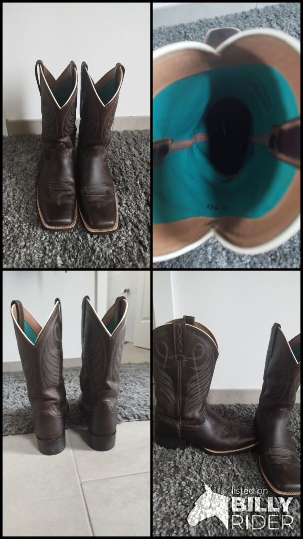 Verkaufe hier ein paar Westernstiefel von Ariat. Mir sind die einfach zu unbequem. Da ich auch mit diesen Boots geritten bin, ist eine Verfärbung an der Innenseite der Boots. Das kommt von meinen Steigbügeln. Das ist aber nicht tragisch.