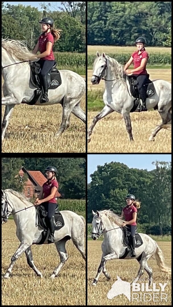 Dieser wunderschöne PRE Hengst mit allerbester Abstammung sucht ein neues 5 Sterne Zuhause. Er ist 5 Jahre jung und hat ein Stockmaß von 174 cm. Damit deckt er auch größere Reiter sehr gut ab. Dieser Goldschatz steht noch im alten, spanischen Typ. Zeigt Campaneo. Der Hengst hat eine komplette große AKU mit Röntgenbildern ohne Befund. Er geht die drei Gundgangarten, macht spanischen Schritt, Kompliment und Kniefall. Zur Zeit wird an der Piaffe gearbeitet. Im Gelände sammelt er gerade Erfahrungen und geht ohne Probleme an der Straße. Er konnte auch schon sein Talent auf einer Messe zeigen und war dort absolut cool und unerschrocken. Mit Wallachen und Stuten kommt er gut klar. Der Hengst kann auch kastriert werden, was aber aufgrund seiner sehr guten Abstammung schade wäre. In seinem Pedigree findet man große Züchternamen des spanischen Pferdes: J.L. de Escalera, M.F. de Escalera, Yeguada Militar, Yeguarda Miura, Yeguada Ferrero, Yeguada Madre. Er ist ein tolles Pferd für den ambitionierten Reiter.