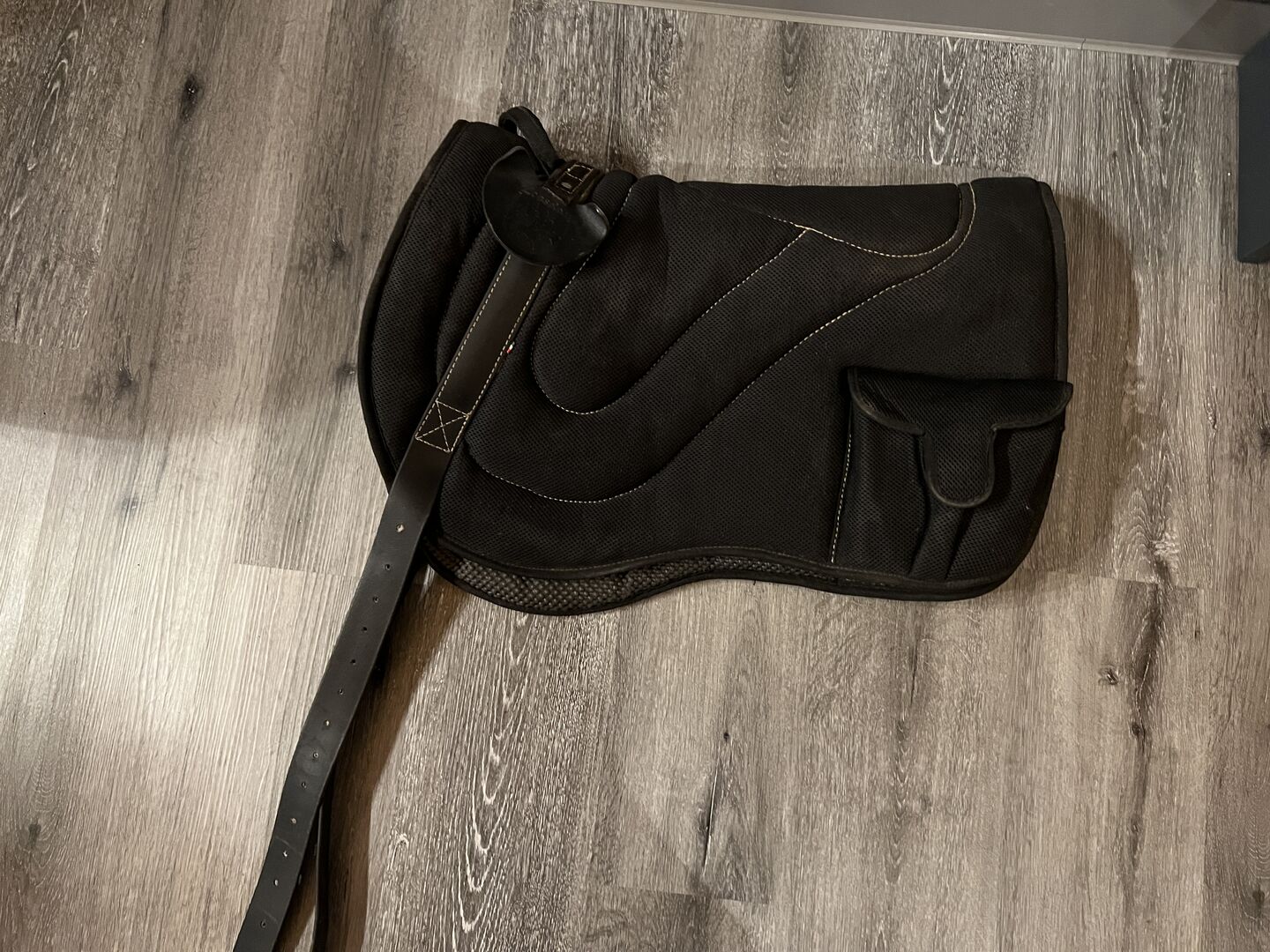 Reitpad von Loesdau mit einem Gurt. Das Pad ist noch schön gepolstert, da es selten genutzt wurde. Am Pad selbst sind unten dran sehr wenig Haare, da es mit Schabracke genutzt wurde, am Gurt sind allerdings einige Haare vorhanden. Der Gurt ist durch das Sympa Nova auch sehr weich gepolstert, die Schnallen allerdings sind leicht angerostet, aber dennoch komplett gängig und funktionstüchtig. Alternativ kann man sich auch einen Westerngurt kaufen, diese passen auch an das Pad.