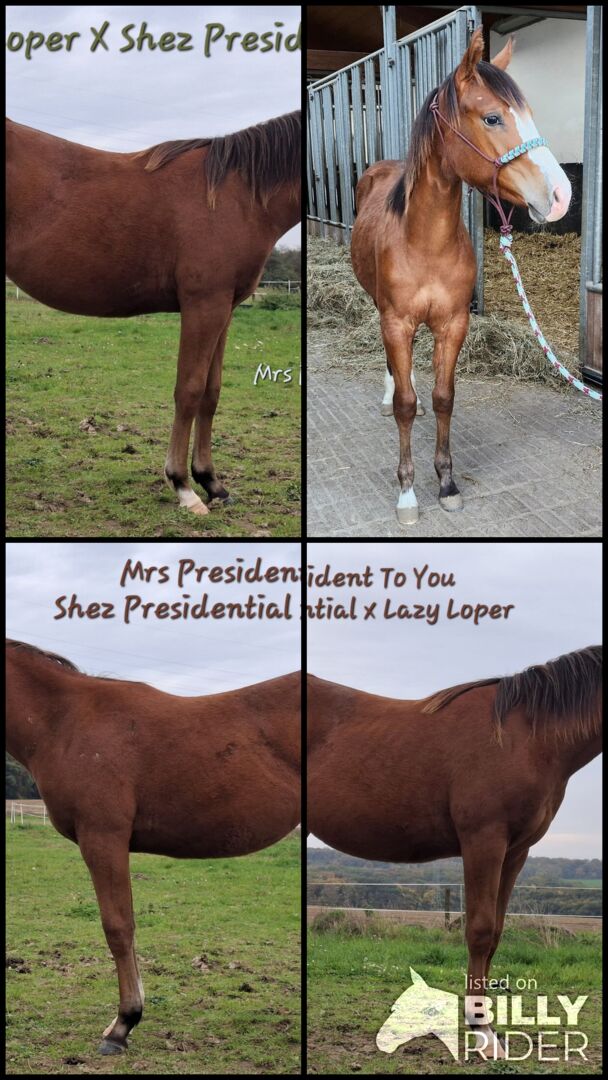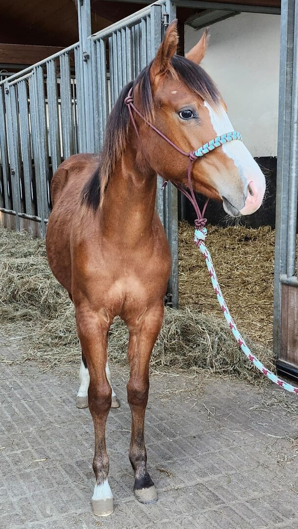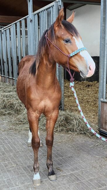 Mrs President To You ist eine bildhübsche Quarter Horse Stute, geboren am 28.06.2024 in der Farbe Bay, mit einem geschätzten Endmaß von ca. 156 cm. Die AQHA-Papiere liegen vor. Sie ist korrekt gebaut, gut entwickelt und ausgewogen bemuskelt, sodass sie später auch größere Reiter gut abdecken wird. Sie zeigt bereits jetzt sehr gute Grundgangarten und bringt damit beste Voraussetzungen für eine sportliche Zukunft mit. Sie stammt direkt von Lazy Loper ab, ihre Mutter, Shez Presidental hat 102 AQHA Punkte. Beide Elternteile wurden erfolgreich im Sport vorgestellt und verfügen über eine erstklassige Pleasure- und Allround-Abstammung. Damit eignet sich die Jungstute sowohl für die Turnierlaufbahn als auch für die Zucht oder als hochwertiger Freizeitpartner mit Perspektive für die Allround-Klassen. Die Stute ist gesund, regelmäßig entwurmt und steht alle vier Wochen beim Hufschmied. Sie besitzt eine sehr gute Hufqualität. Die Stute wächst im Herdenverband auf und kennt das Fohlen-1x1, ist halfterführig und altersgerecht erzogen. Sie ist 4-Panel n/n und GBED n/p. Charakterlich zeigt sie sich sehr lieb, menschenbezogen und neugierig, sie möchte gefallen, lernt schnell und ist im Umgang brav, kann altersbedingt aber auch mal frech werden. Daher wünscht sie sich einen erfahrenen Menschen, der sie weiterhin altersgerecht fordert und fördert. Ob zukünftiges Showpferd oder verlässlicher Freizeitpartner - mit ihrem Potenzial für die Allround-Klassen ist Mrs President To You ein echtes Versprechen für die Zukunft.