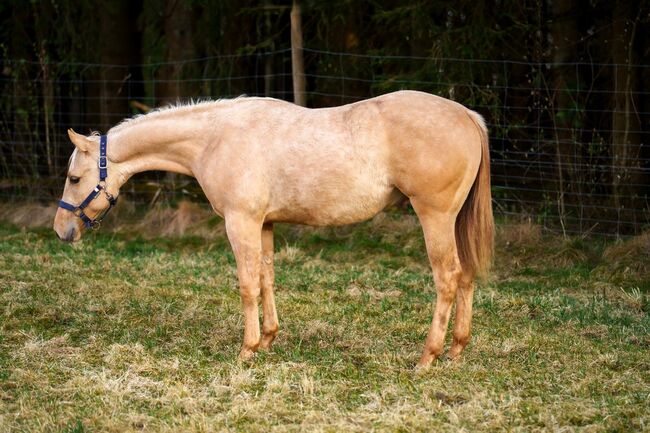 UG Commander Spook - ein bildschöner Quarter Horse Hengst in der besonderen Farbe Dunalino, geboren am 19. März 2024. Mit einem geschätzten Endmaß von etwa 150 bis 152 cm bringt er die perfekte Größe für Sport und Freizeit mit. Sein kompakter, korrekt gebauter Körperbau und die stabilen Proportionen lassen bereits jetzt vielversprechende Perspektiven für die Zukunft erkennen. Er wächst artgerecht in einer gemischten Wallachherde auf und darf dort in aller Ruhe unter besten Bedingungen groß werden. Spook ist gesund, altersgemäß geimpft und regelmäßig entwurmt. Charakterlich zeigt er sich absolut liebenswert: menschenbezogen, freundlich, aufgeschlossen und sehr lernwillig. Er begegnet neuen Situationen aufmerksam, bleibt dabei jedoch stets brav und unkompliziert. Das Fohlen-1x1 beherrscht er selbstverständlich und ist bereits halfterführig. Mit seiner hervorragenden Reiningabstammung bringt er beste Voraussetzungen für eine spätere Karriere im Sport oder Turnier mit, eignet sich aber ebenso gut für den vielseitigen Freizeiteinsatz. Sein Vater ist der gekörte und erfolgreiche QH Hengst Best Sook. Spook`s Mutter ist eine Dun It On The QT Tochter. Er ist bereits in das NRHA- und EWU-Jungpferdeprogramm einbezahlt und stellt damit eine tolle Investition in ein Nachwuchspferd mit Zukunft dar. UG Commander Spook vereint Optik, Charakter und Leistung in einem rundum gelungenen Gesamtpaket.