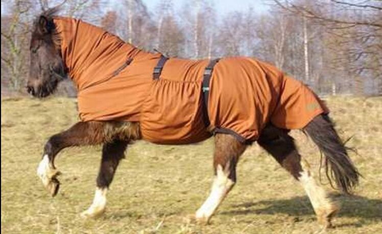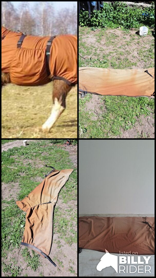 Sie mit zwei kleinen Löcher was ihre Funktion nicht einschränkt und ist an einer Stelle gemäht worden. Am Schweifschutz einmal vom Fohlen durchgekaut. Sie ist ein wenig von der Sonne ausgeblichen. Sie kann mit Fliegenmaske in dunkelbraun abgegeben werden. Ohne jegliche Mängel fast neu. (30€)
