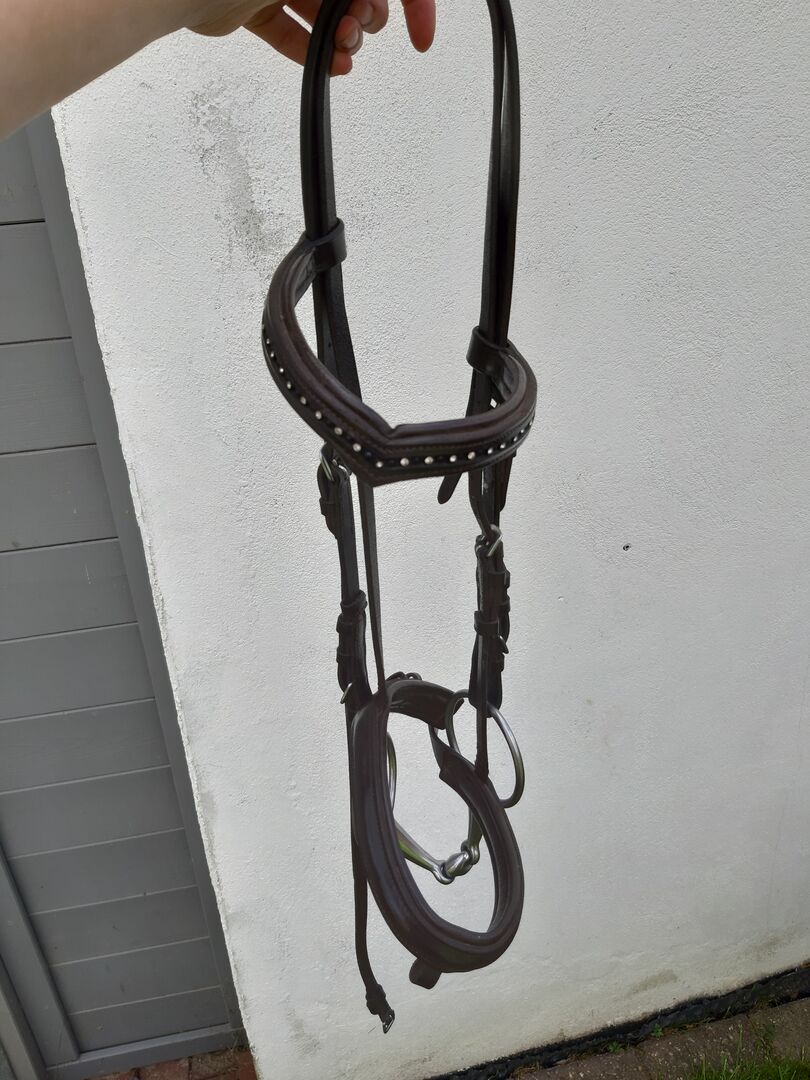 Verkaufe meine braune Trense mit schickem Stirnband. Doppelgebrochenes Gebiss inklusive. Sehr guter Zustand.
