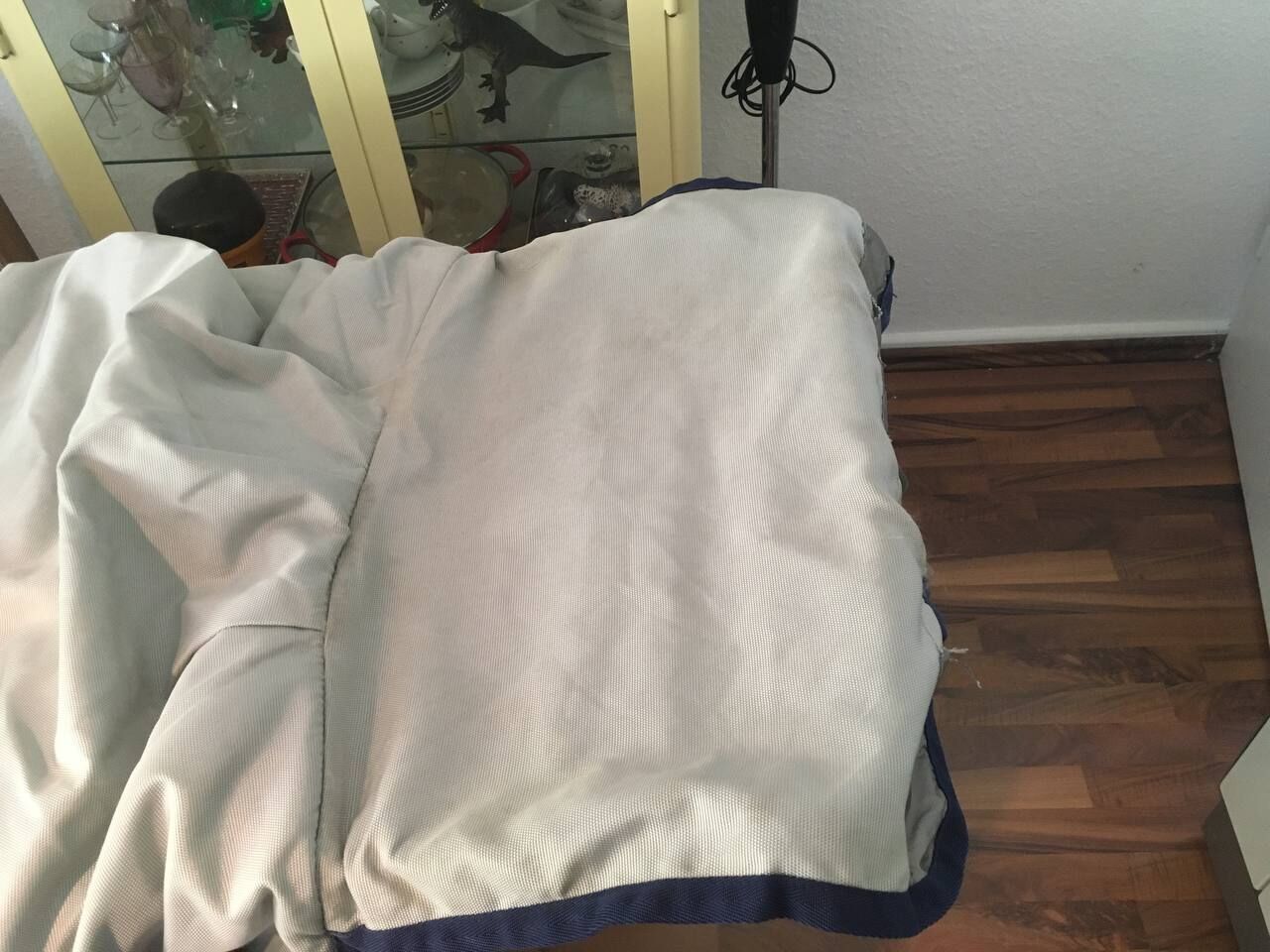 Die Decke wurde letzte Saison zum Ende eigentlich gereinigt und imprägniert, dann wurde es allerdings noch mal kalt und unser Pony trug sie noch mal für genau eine Nacht, daher kommen die Flecken. Diese würden aber bei einer nächsten Wäsche sofort verschwinden.