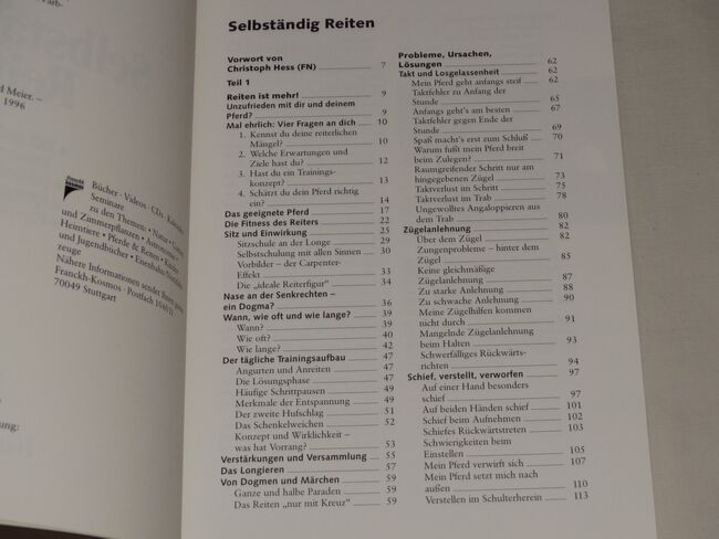 Gutes Buch! Hier werden Ursachen erläutert und Lösungen angeboten für Dressur- und Springreiten. Hab mir da schon viele Tipps rausholen können.