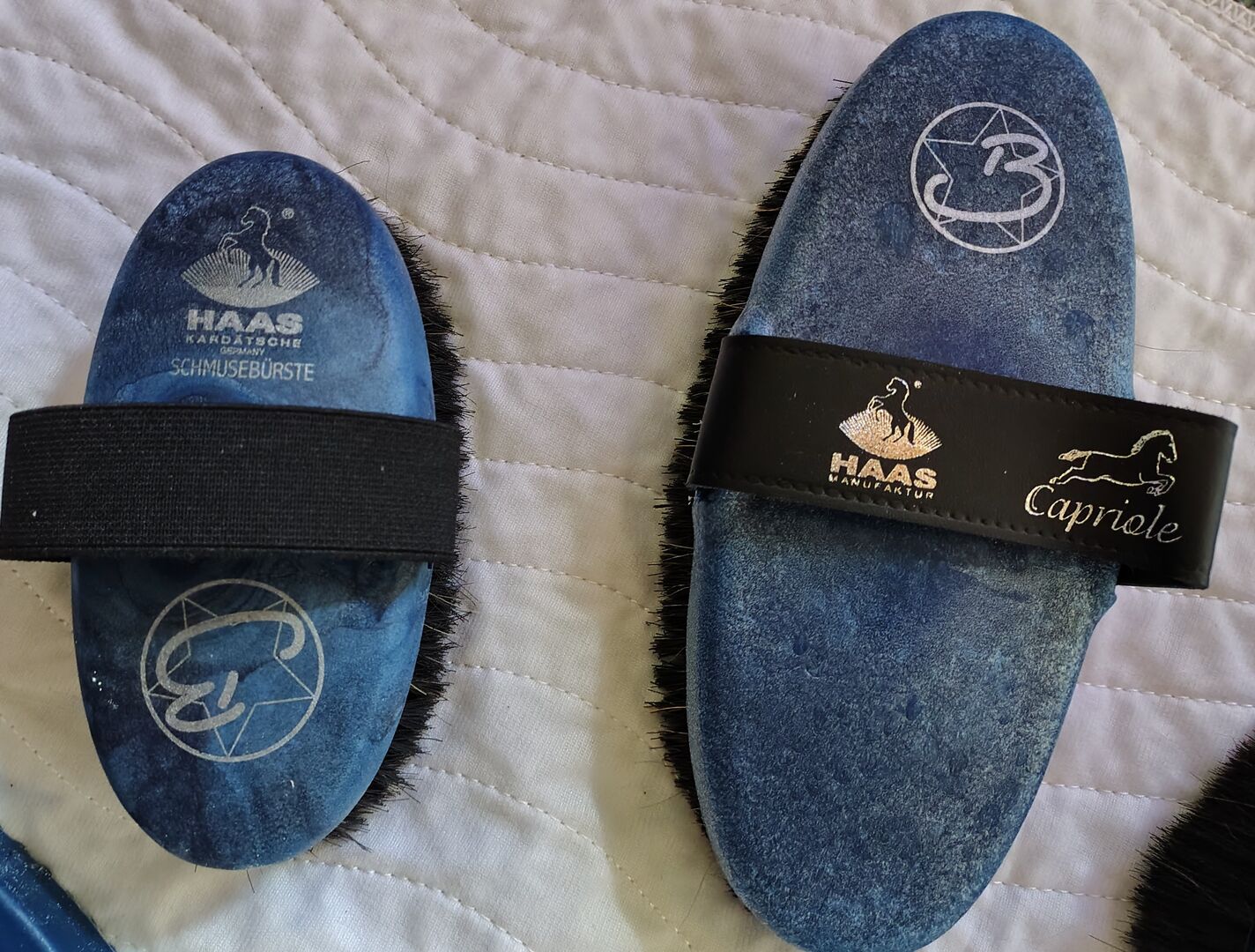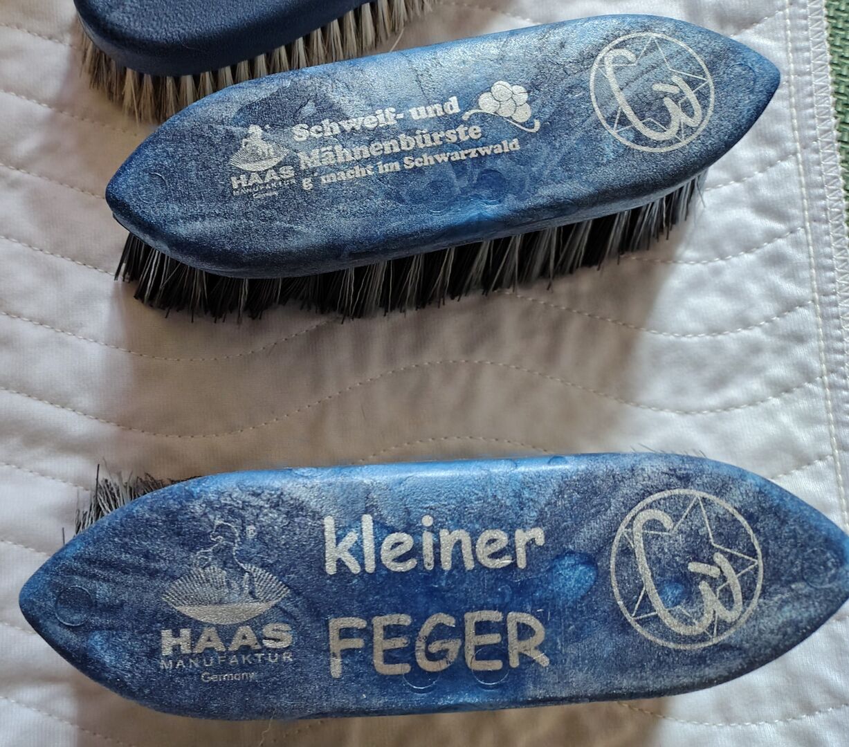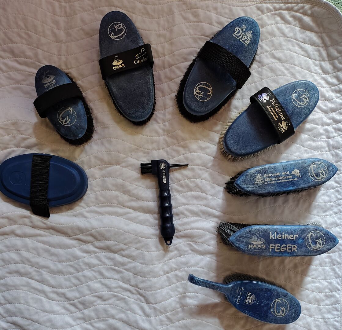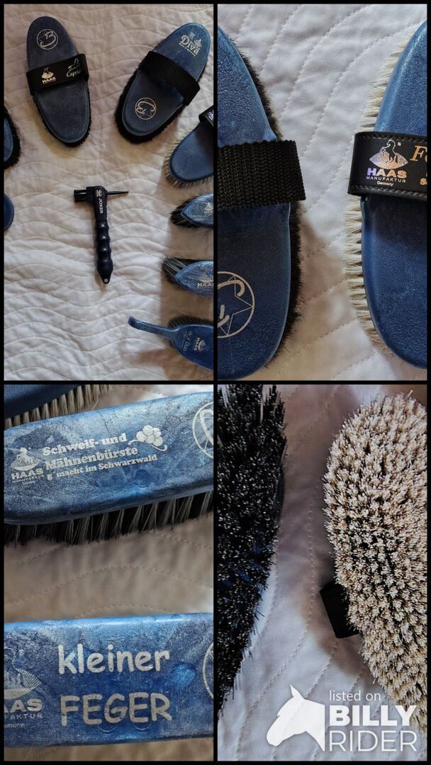 Es besteht aus 1 "Diva" Bürste mit Lammfellkissen 1 Kardätsche "Capriole" 1 Fellglanzbürste 1 weiche Schmusebürste 1 Hufkratzer "Joker" 1 Striegel soft "New Generation" 1 Huf Duo Azzuro 1 Mähnenbürste kleine 8 cm Bordstenlänge "Kleiner Feger" 1 Schweif- und Mähnenbürste klein 5 cm Bordstenlänge