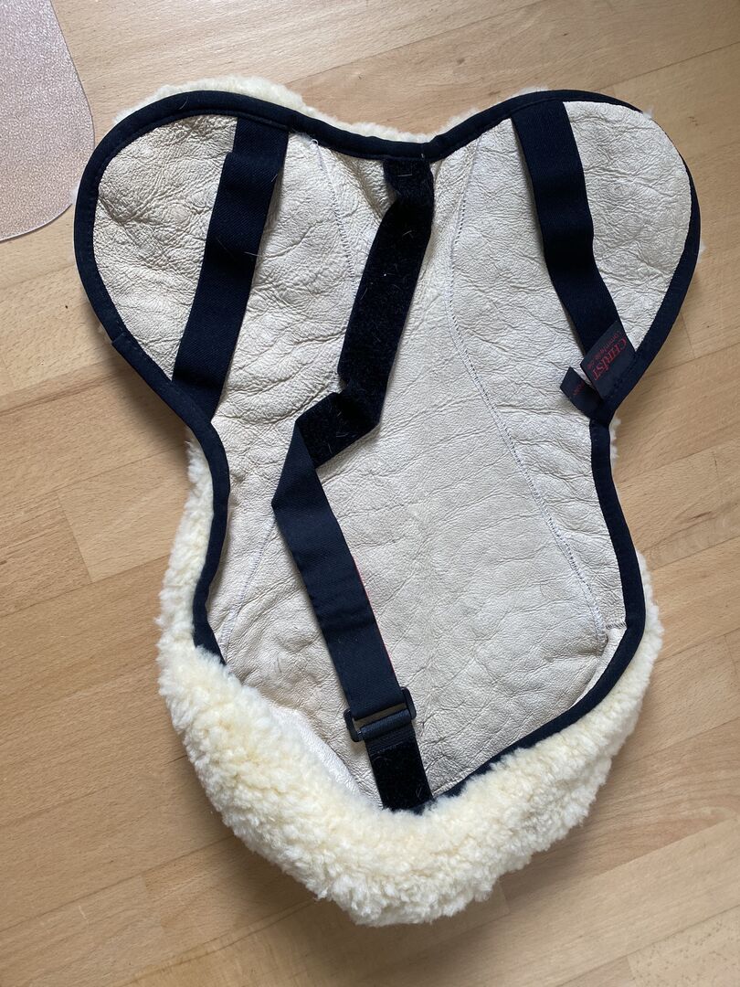 Verkaufe hier einen NEUwertigen Sattelsitzbezug aus echtem Lammfell der Firma CHRIST. Endlich ein Sitzbezug ohne störende Mittelnaht!!! Der Sattelsitzbezug aus echtem Lammfell ist mit seiner Schnittform optimal an englische Sättel angepasst. Er bietet dem Reiter ein sehr hohes Maß an Komfort, Weichheit und Wärme. Befestigt wird er durch das Überziehen über den Sattelkranz und eines klettbaren Bandes durch die Sattelkammer. Zwei Gummibänder fixieren ihn seitlich. Die Wollhöhe beträgt ca. 30mm. Der Artikel ist maschinenwaschbar mit einem Lammfellwaschmittel sowie trocknerbeständig. Sitzlänge: 46cm;Blattlänge: 21cm; UVP:75€ Weitere Artikel werden eingestellt! Kombiversand möglich!