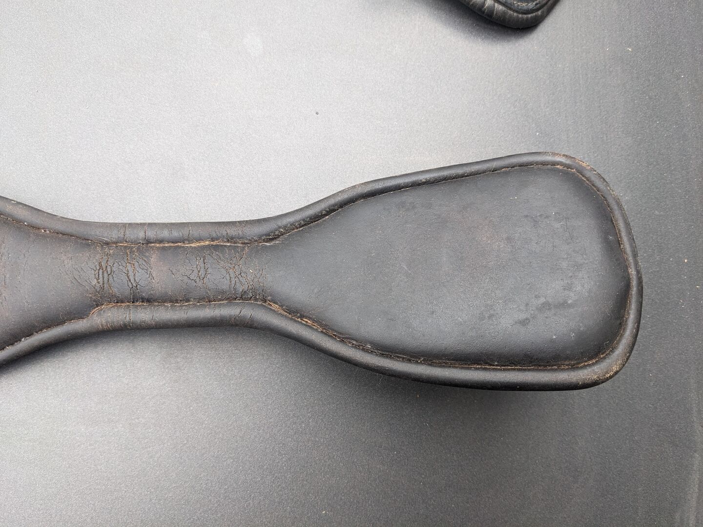 Gut erhaltener Kurzgurt der Marke Cobra. Keine Beschädigungen, also offene Stellen im Leder. Gebrauchsspuren sind auf den Fotos ersichtlich. Als Zugabe gibt es einen schon ziemlich benutzen Amerigo Gurt, der zum wegschmeißen einfach zu schade ist.... Aber hat schon sehr deutliche Gebrauchsspuren hat und nur verschenkt werden kann.