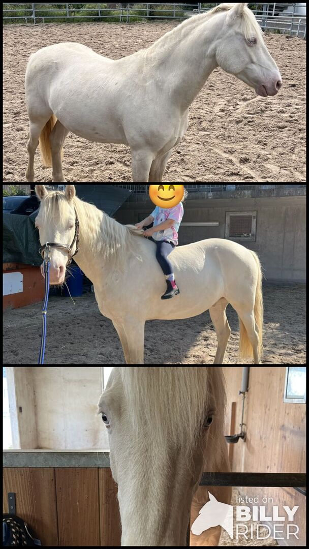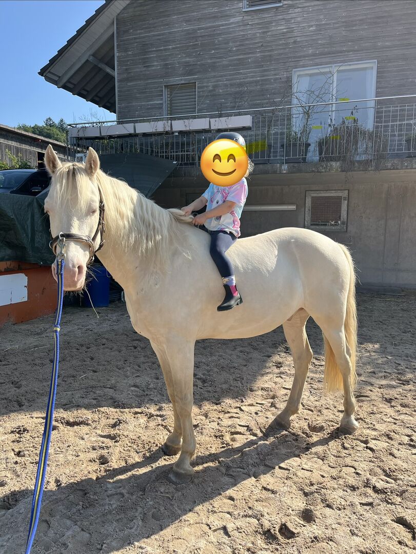 Wir verkaufen unseren Connemara Wallach, 6-jährig (im Juni 7), Stockmass 1.40 m, in der speziellen Fellfarbe Perlino.