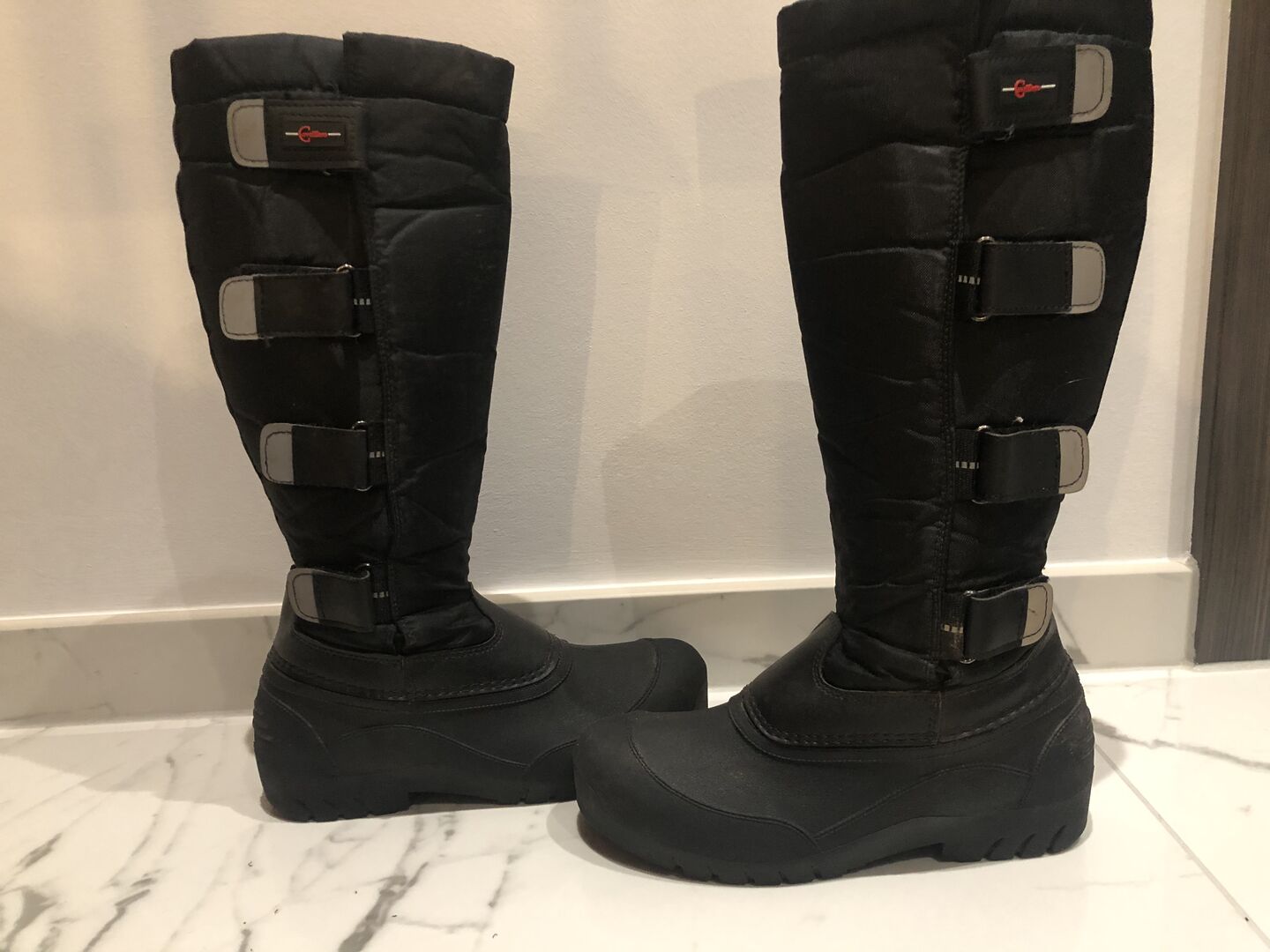 Mollig warm durch herausnehmbaren Innenstiefel aus thermoisolierendem Material Winterreitstiefel mit verstellbaren Klettverschlüssen für unterschiedliche Wadenbreiten Wasserdichter Synthetikschuh mit Profilsohle passend für den Steigbügel Der Stiefel hat ein pflegeleichtes Außenmaterial