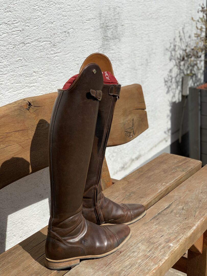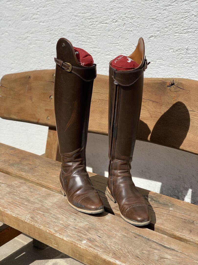 Deniro Green Stifel in braun Modell von Jessica von Bredow-Werndl. Der Stiefel ist aus Veganem Leder. Ich muss sie leider verkaufen da ich sie zu groß gekauft habe und sie nur kurz getragen da ich sie für den Übergang braucht bis die passenden Stiefel gekommen sind. Sie haben leider schon ein paar Gebrauchspuren aber nur äußerliche. Sie sind super bequem zu tragen trotz der soften Außenversteifung. Sie sind ganz leicht mit einem feuchten Lappen zu reinigen. Die Stiefelsäcke, Stiefeltasche und die Stiefelspanner sind inklusive. Neupreis 764€