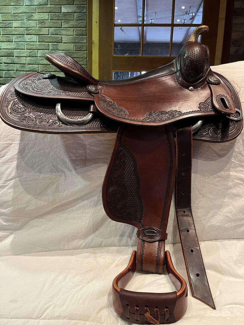 Ein sehr schöner Sattel mit aufwändiger 7/8 Flower-Basket-Punzierung, sehr hochwertig verarbeitet. Zudem bringt er viel Ristfreiheit mit.