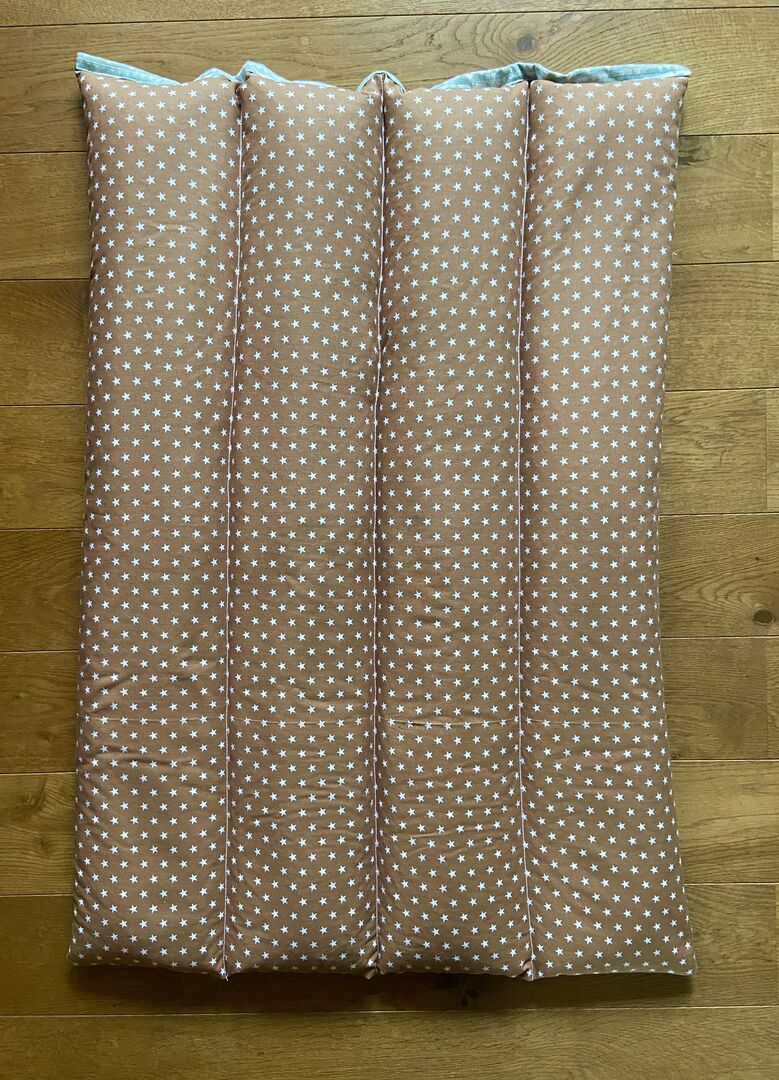 Die Maße: Das Kissen aus hellblauen Webstoff, Rückseite braun mit Sternchen: 99 x 66 cm Das rosa-weiß-braune Kissen mit Westernmotiven, Rückseite braun mit Sternchen: 98 x 70 cm