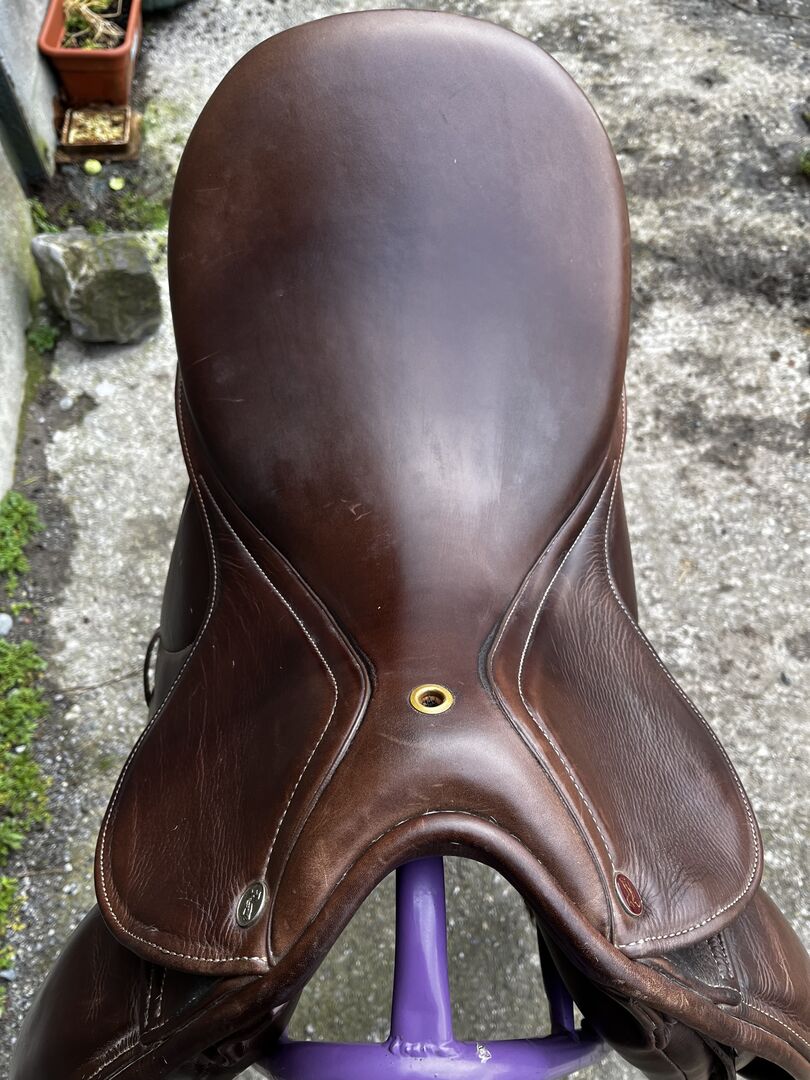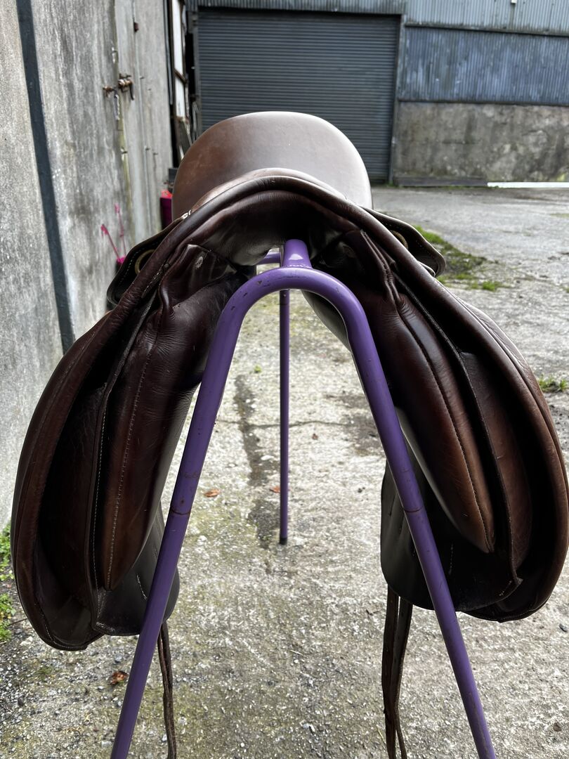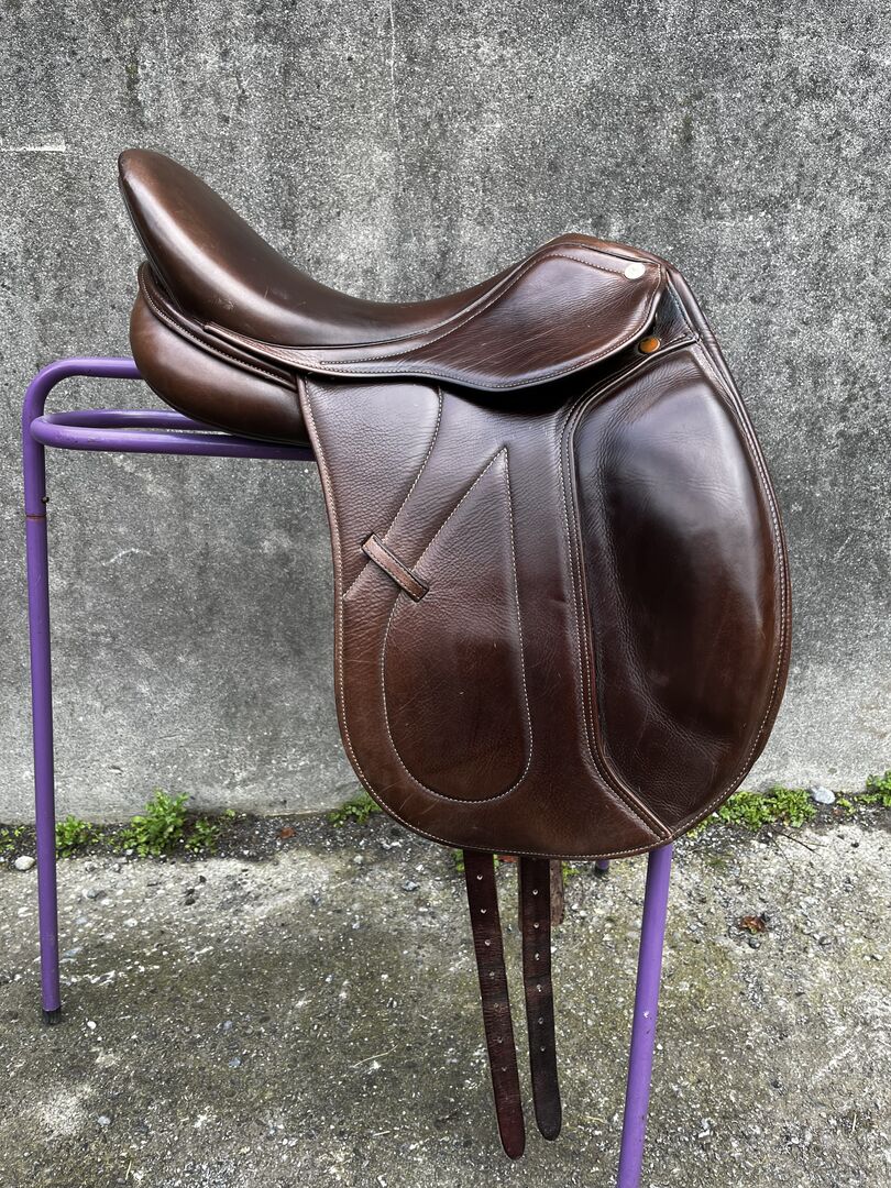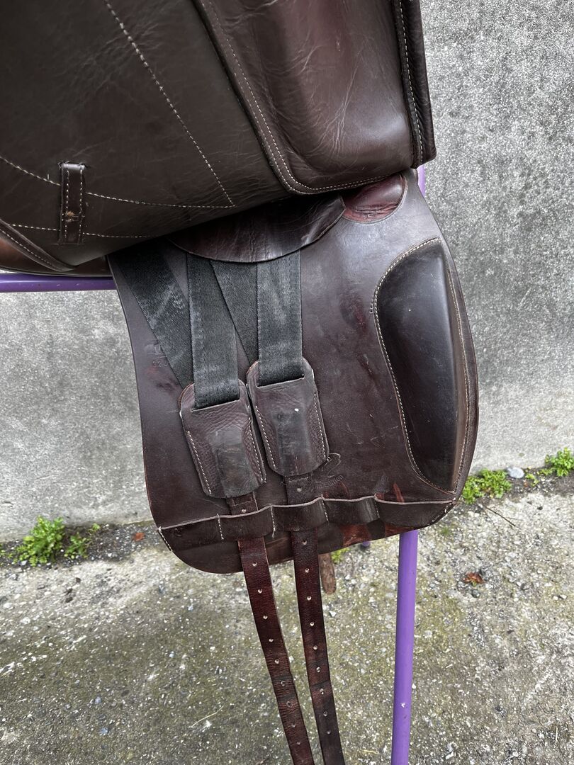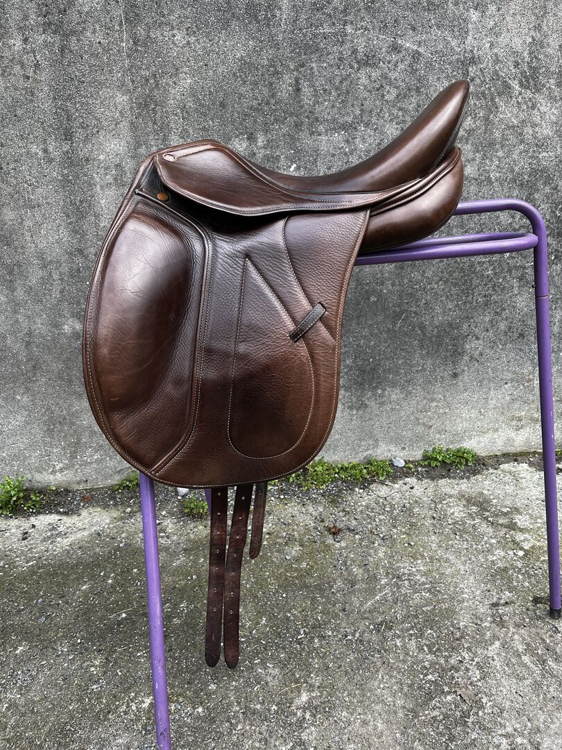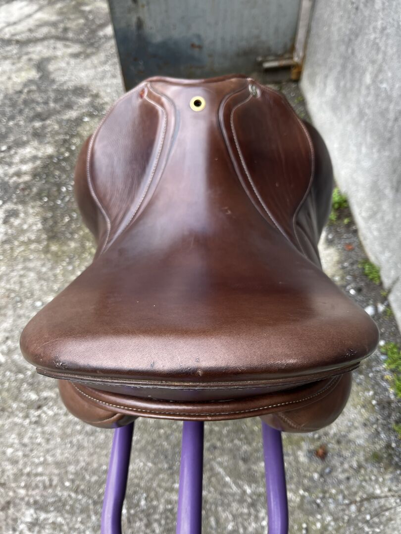 DP Maxima Dressursattel importiert aus Deutschland. 17,5 Zoll Sitz. Einzigartiges Design; Schulterentlastungspanele und ein zurückgeschnittener Kopf. Die Kissen sind mit einem Schichtensystem aus Wollbeflockung, Schaumstoff und einem stoßdämpfenden Netz gefüttert. Die Beflockung kann von jedem Sattler geändert werden. Einzigartiges Vier-Punkt-Gurtsystem, das eine breite Druckverteilung mit vier verschiedenen Gurtpositionen gewährleistet, je nach Art, Form und Position der Gurtdurchführung jedes einzelnen Pferdes. Vollständig einstellbarer Karbonfederbaum, der von schmal bis extra breit reicht. Die Einstellung erfolgt mit einem Inbusschlüssel im Vorderzwiesel. Ein Sattel kann wirklich für fast alle Pferde passen. Sitz und Vorderzwiesel sind für den Komfort des Reiters ausgelegt. Schenkelpauschen in guter Größe. Der Sattel hat sich in einem Druckverteilungs-Test gegen viele andere Sattelmarken durchgesetzt. Der Sattel ist in ausgezeichnetem Zustand, alle Nähte und das Leder sind wie neu. Ein wirklich schöner Sattel. Post möglich.