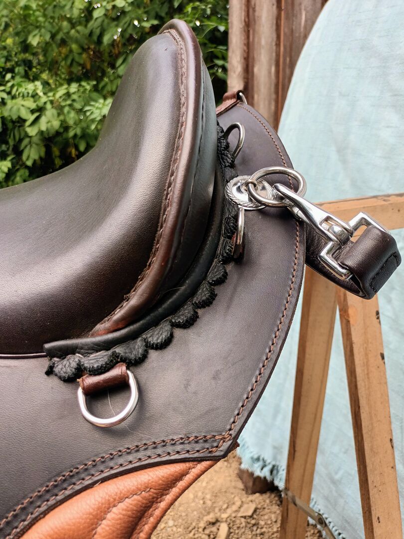 Lederbaumsattel, der durch seine besondere Bauweise ohne Kopfeisen auskommt. Er paßt sich nach mehrmaligem reiten optimal dem Pferderücken an. Durch die Klettkissen ( dabei sind 46 cm Kissen) läßt sich der Wirbelkanal individuell einstellen. Gefertigt aus hochwertigem Kliger-Leder, offener Steigbügelaufhängung, 3-Punkt Gurtung, Klettpauschen, Schweifriemenhalterung und Ringen für Gepäck. Der gepolsterte Sitz ist ein Traum. Meine RB mit Konfektionsgröße 44 saß prima, ich habe mir mit Konfektionsgröße 38 einen Fellsitz auf den Sattel und saß super.