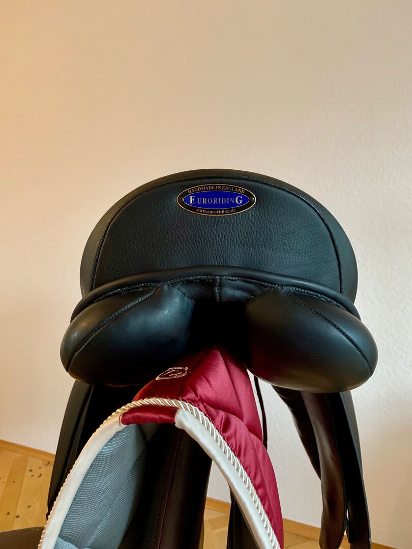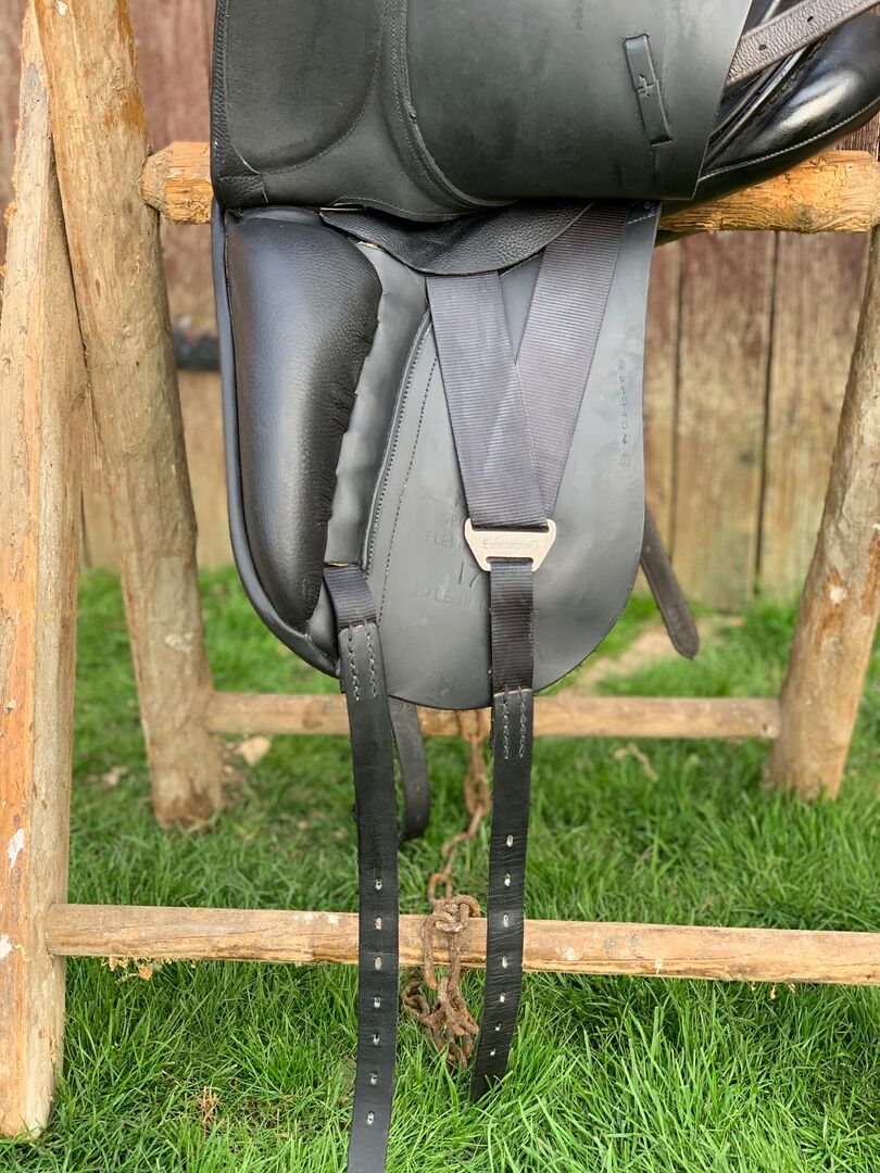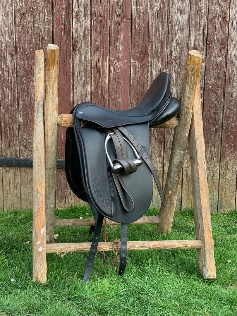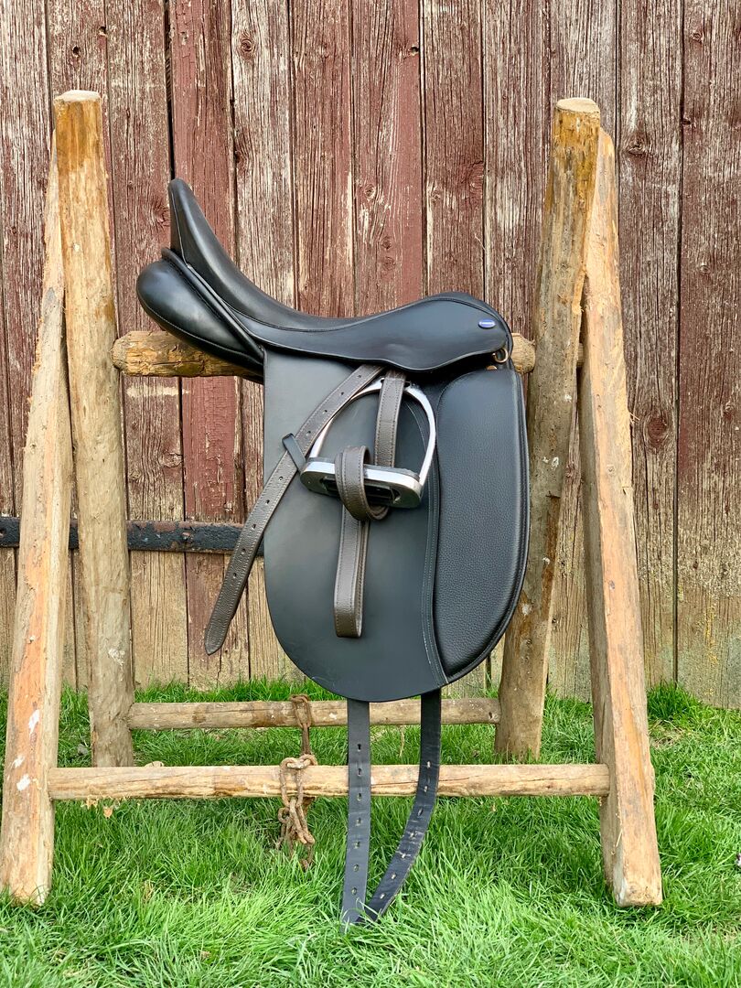 Dressursattel, in schwarz mit 17" und einer mittleren Kammerweite an. Er hat wie man sehen kann ein eher stumpfes Leder, was einfach super ist da man nicht hin und her rutscht sondern wirklich fest sitzen kann.