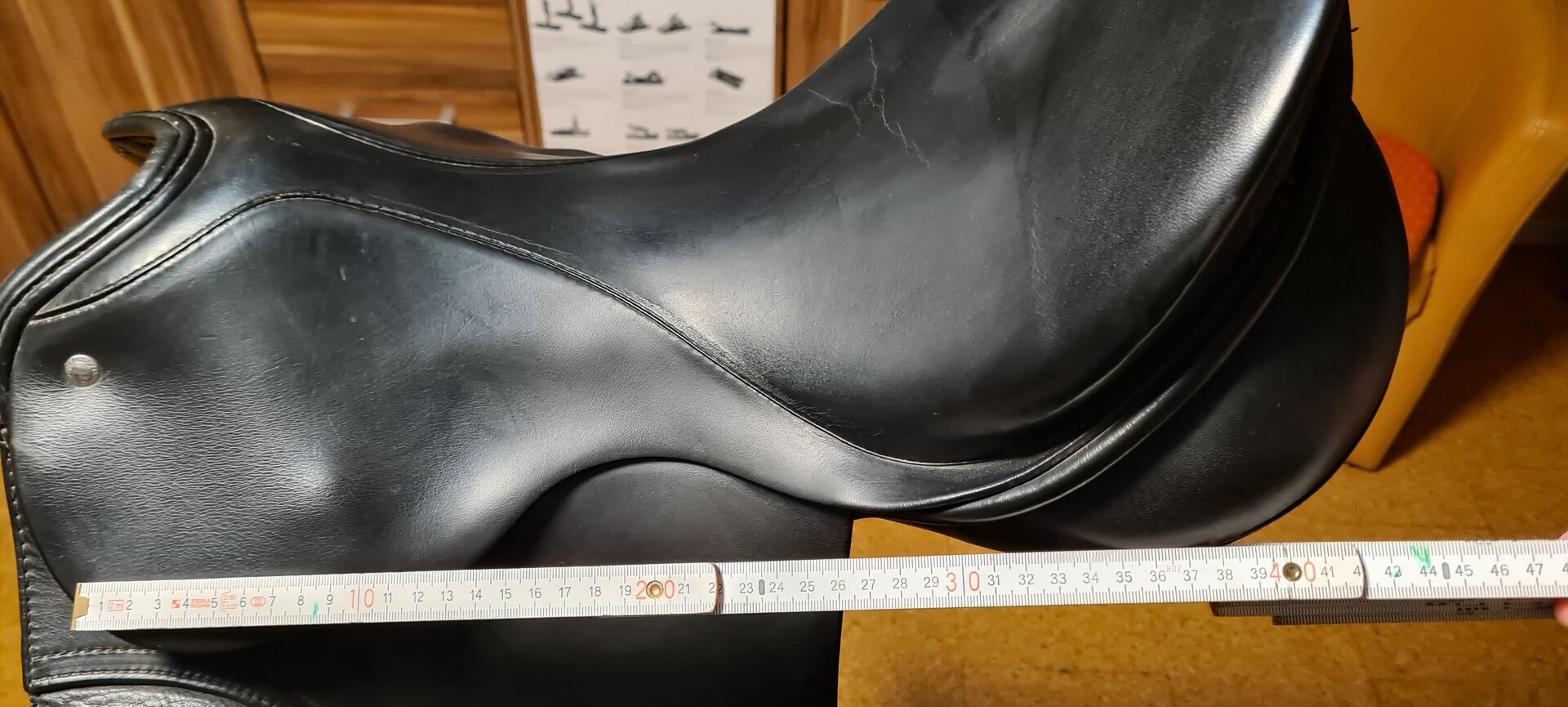 Gut gepflegter Dressursattel für Pferde mit kurzem Rücken. Sitzfläche 17,5 Zoll, Sattelblätter extra kurz 44cm, Kammerweite 13, Sattellänge 45cm, Vorgurtstrippe