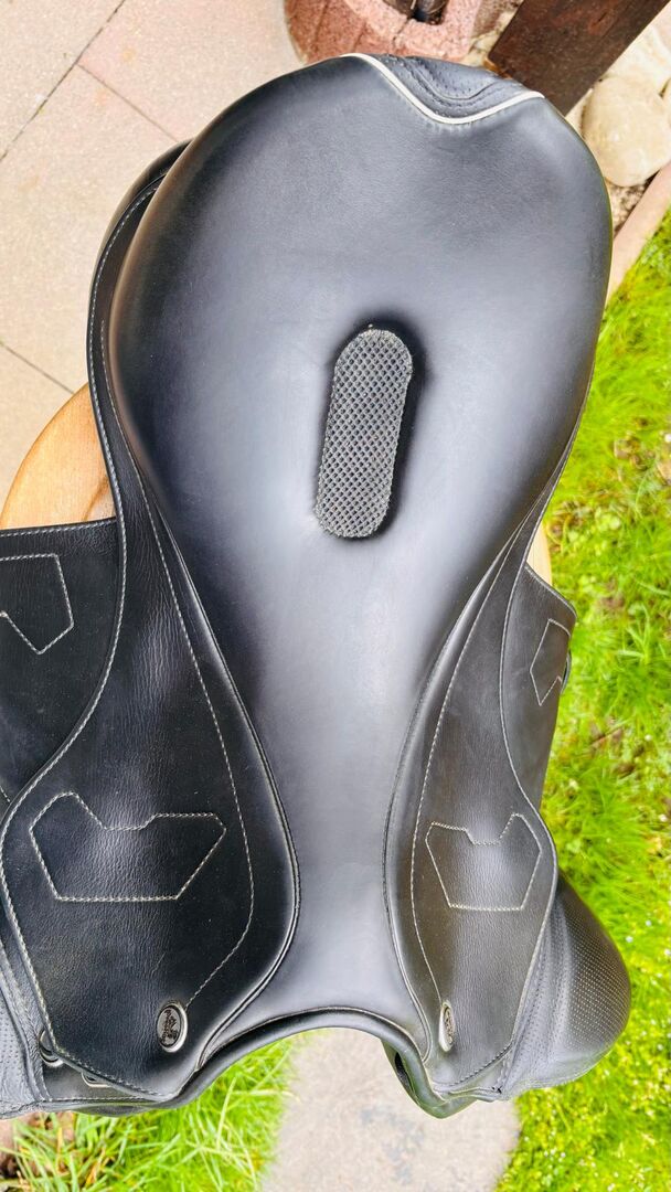 Diese Aussparung auf der Sitzfläche hat die doppelte Funktion der Belüftung und damit Kühlung des Pferdes wie des Reiters sowie die Entlastung des Steißbeins.