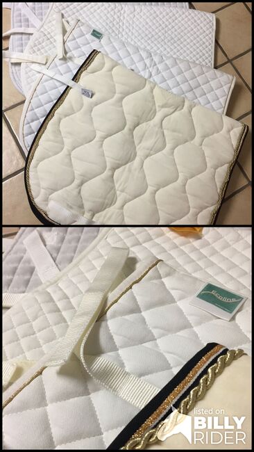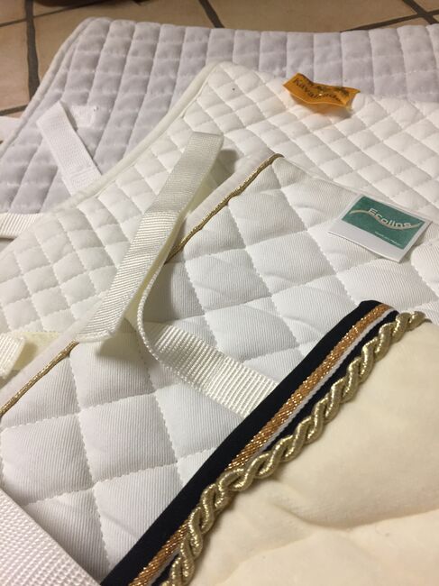 Die Schabracken haben eine Rückenlänge von 56-62 cm. Die erste cremefarbene Schabracke ist 56 cm lang und aus samt. Die beiden mittleren Schabracken sind 60 cm lang und aus Baumwolle. Die letzte hintere Schabracke ist 62cm lang und ebenfalls aus samt.