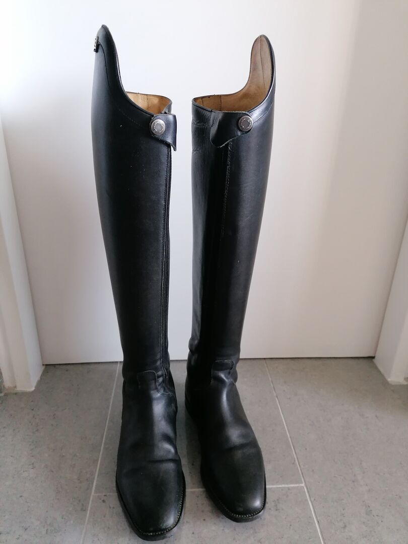 Die Stiefel sind hoch geschnitten und besteht aus formstabielem Leder, was die Beine beim Dresaurreiten sehr schön hinlegt, trotzdem sind die Stiefel sehr bequem. Würde ich sie weiterhin tragen können, würden sie mich sicher noch viele Jahre begleiten.