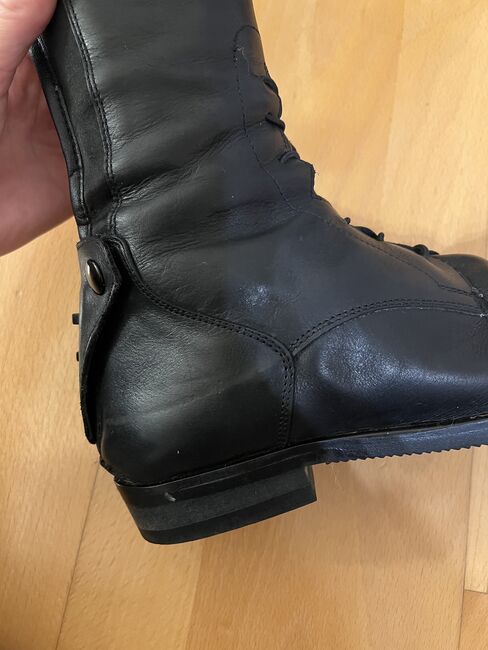 Der Stiefel hat vorne eine klassische Springstiefel Schnürung, einen Verschluss am oberen Schaft und einen Reisverschlussschutz mit Dreifachem Sporenhalter.
