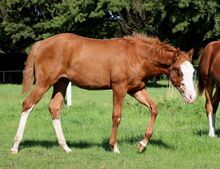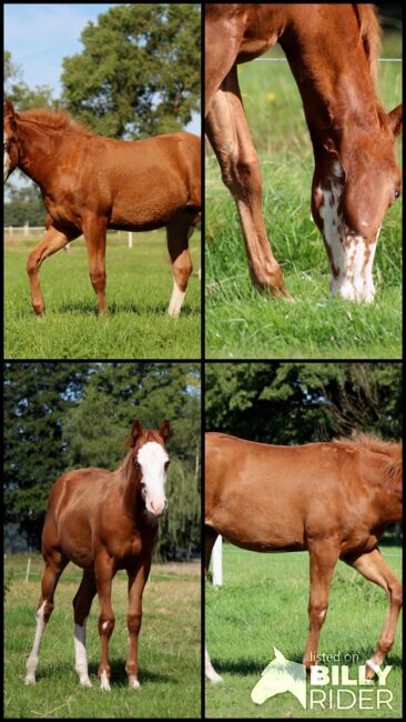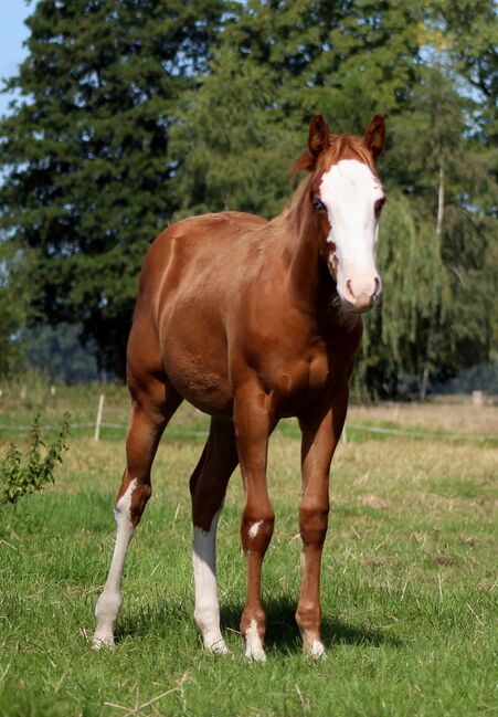 Custom Splash, geboren am 19.03.2025 mit einem Endmaß von ca. 150-153 cm, ist eine außergewöhnliche Sorrel Splash Quarter Horse Stute, die sofort ins Auge fällt. Mit ihrem markanten, ausdrucksstarken Gesicht, dem auffälligen blauen Auge links und dem partiell blauen Auge rechts sowie ihrer Fellzeichnung zieht sie alle Blicke auf sich - ein echtes Pferd, das im Gedächtnis bleibt. Ihr großrahmiger, moderner Körperbau, die perfekte Bemuskelung und die harmonische Balance spiegeln ihre natürliche Athletik und Leistungsbereitschaft wider. Sie zeigt von Natur aus Talent für Reining: elegante Körperkontrolle, eine angenehme Selbsthaltung und bemerkenswerte Balance machen sie zu einem vielversprechenden Prospect für ambitionierte Reiter (Non Pro und Open). Doch nicht nur ihr äußerer Auftritt und ihr Potenzial machen sie besonders - Custom Splash überzeugt auch durch ihren Charakter. Sie ist neugierig, aufgeschlossen und sehr menschenbezogen. Ruhig, entspannt und verschmust geht sie auf Menschen zu und lernt schnell Neues. Halfterführig, vertraut mit dem Fohlen-ABC, an Hufegeben, Putzen, Tierarzt- und Hufschmiedbesuche gewöhnt, zeigt sie von Anfang an ein vorbildliches Verhalten. Aufgewachsen im Herdenverband, kennt sie sowohl Box- als auch Offenstallhaltung und erhält eine ausgewogene Fütterung mit Aufzuchts- und Mineralfutter. 5-Panel und Mhym n/n. Sie ist NRHA Germany SSP eingezahlt. Custom Splash ist nicht nur ein Pferd mit herausragendem Reining-Potenzial, sondern auch ein echter Eyecatcher mit erstklassiger Abstammung (Custom Crome x Gunners Last Oak). Sie ist die Stute, die im heutigen Reining-Sport gefragt ist, und bietet sowohl ambitionierten Reitern als auch Züchtern die perfekte Kombination aus Leistung, Ausstrahlung und großrahmigem Typ. Die Abgabe erfolgt direkt vom Züchter - hier wartet ein einmaliges Pferd, das sowohl im Sport, in der Zucht oder als Freizeitpartner begeistern wird.