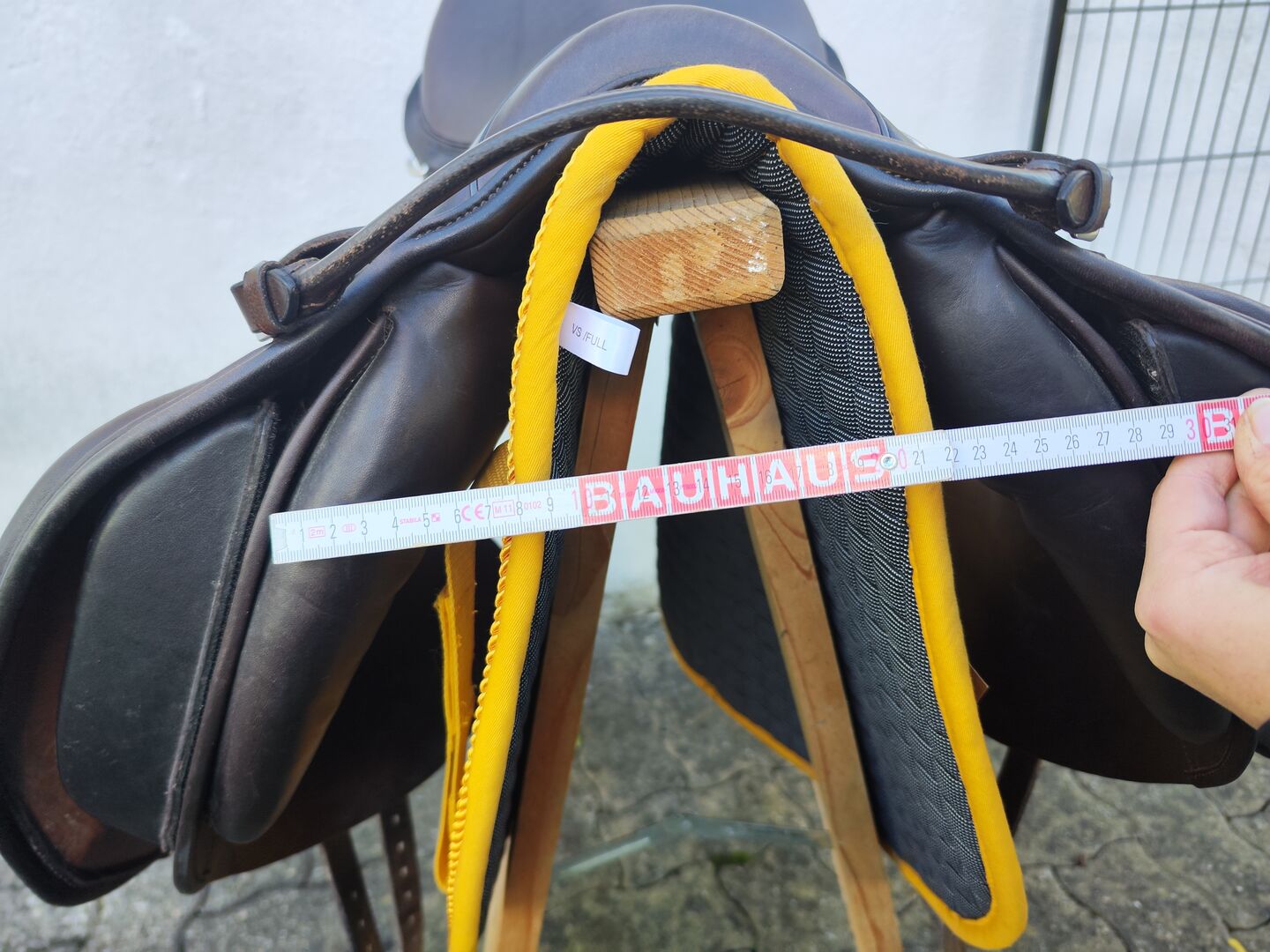 V-Gurtung, Strupfen für Kurzgurt Klettpauschen. Französische Bananenkissen, kurze Auflagefläche (ca. 42/43cm) Sehr breite Kammerweite, die selbstverständlich vom Sattler verändert werden kann. Lag auf breitem, kurzen Fribi mit recht geradem Rücken.