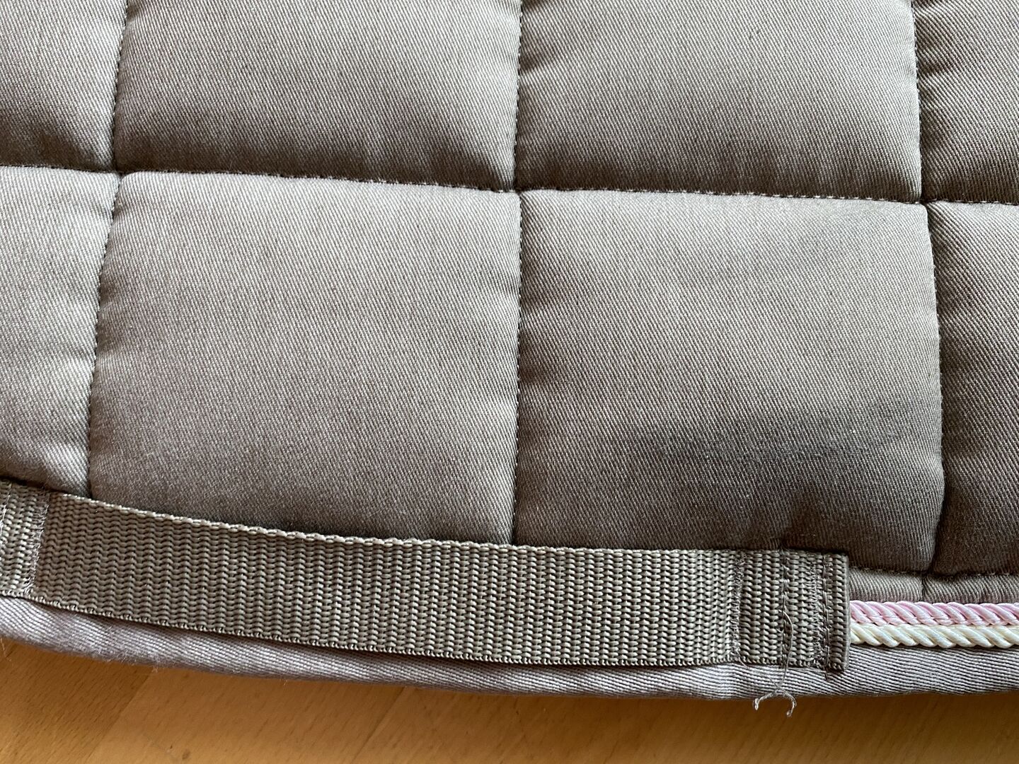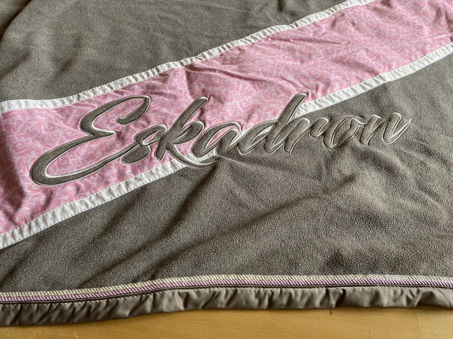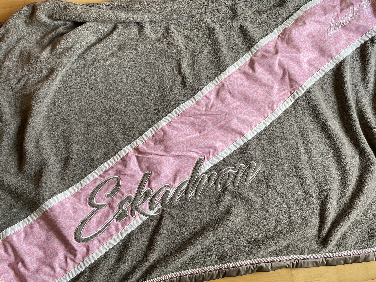 Auch die Abschwitzdecke aus weichem Fleece hat die schöne Garbe ChocoChip. Der Querstreifen hebt sich nicht nur farblich in Powderrose ab, sondern ist auch dezent gemustert. Die Decke verfügt, ebenso wie die Schabracke, über eine farblich passende Doppelkordel. Im Widerrist-Bereich befindet sich eine weiche Polsterung. Auch die Decke lag nur 3 Mal auf dem Pferd.