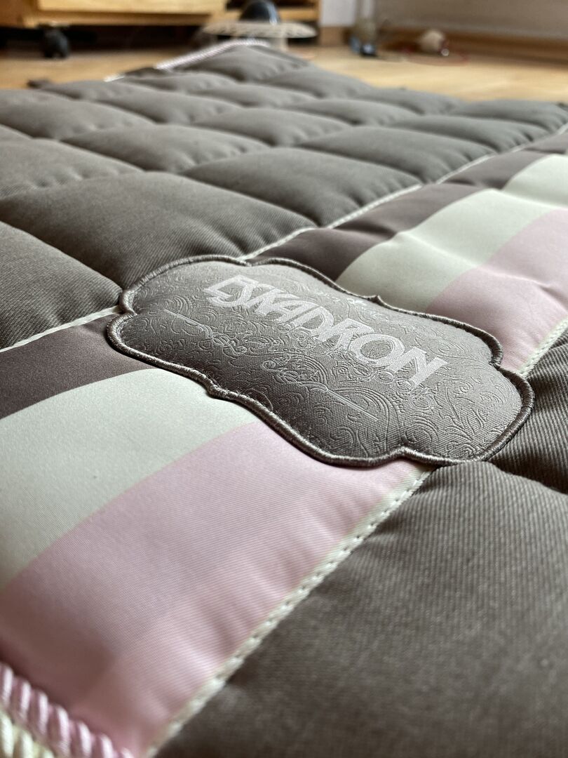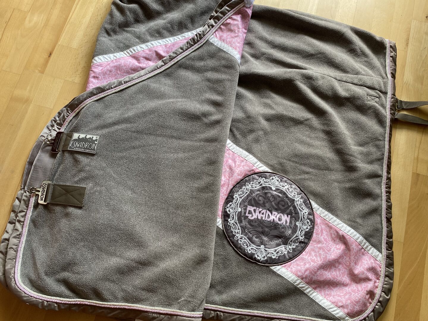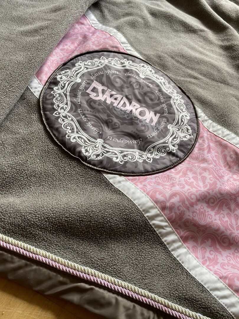 Auch die Abschwitzdecke aus weichem Fleece hat die schöne Garbe ChocoChip. Der Querstreifen hebt sich nicht nur farblich in Powderrose ab, sondern ist auch dezent gemustert. Die Decke verfügt, ebenso wie die Schabracke, über eine farblich passende Doppelkordel. Im Widerrist-Bereich befindet sich eine weiche Polsterung. Auch die Decke lag nur 3 Mal auf dem Pferd.