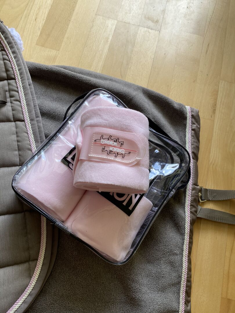 Die Bandagen aus weichem Fleece (Länge 3,5m) sind in der schönen Farbe Powderrose und waren noch nie am Pferd. Sie befinden sich in der Originalverpackung.
