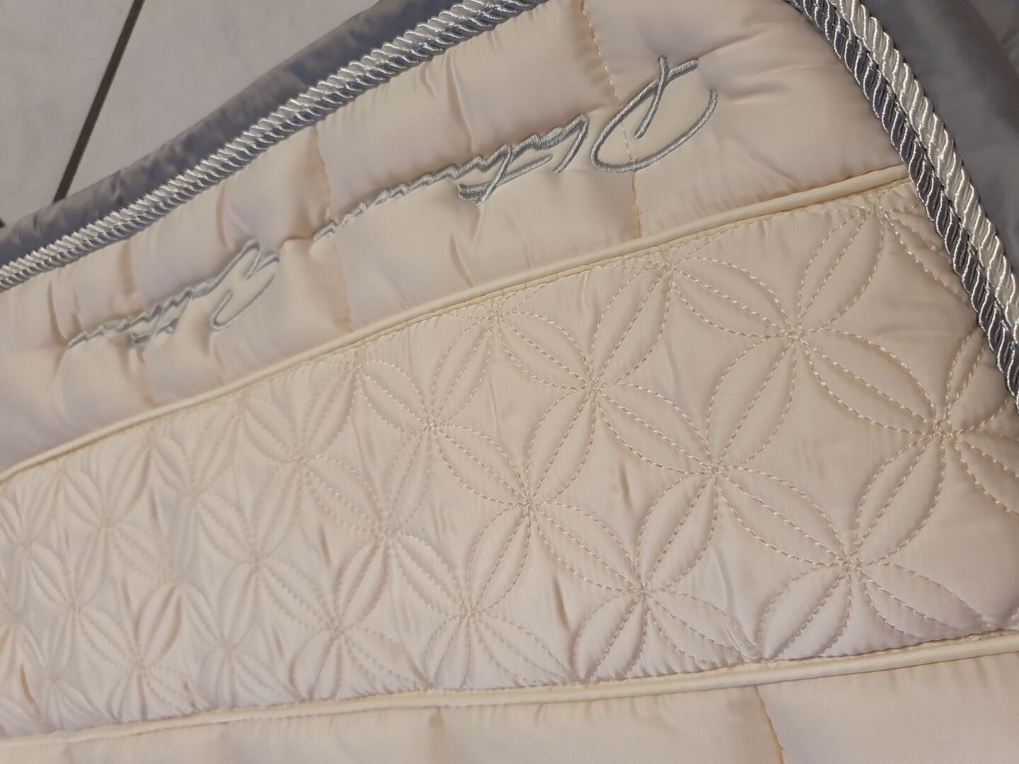 Ich biete hier eine kaum benutzte Schabracke von Eskadron aus einer Platinum Kollektion an. Sie ist an sich in neuwertigem Zustand, hat aber leider einen Schnitt im Oberstoff, den ich genäht und mit Textilkleber abgedeckt habe... Ich hatte leider im Kofferraum vom Auto neben diversem anderem Kram Messer und Schabracke liegen und die Wege haben sich irgendwie gekreuzt. Daher so günstig.