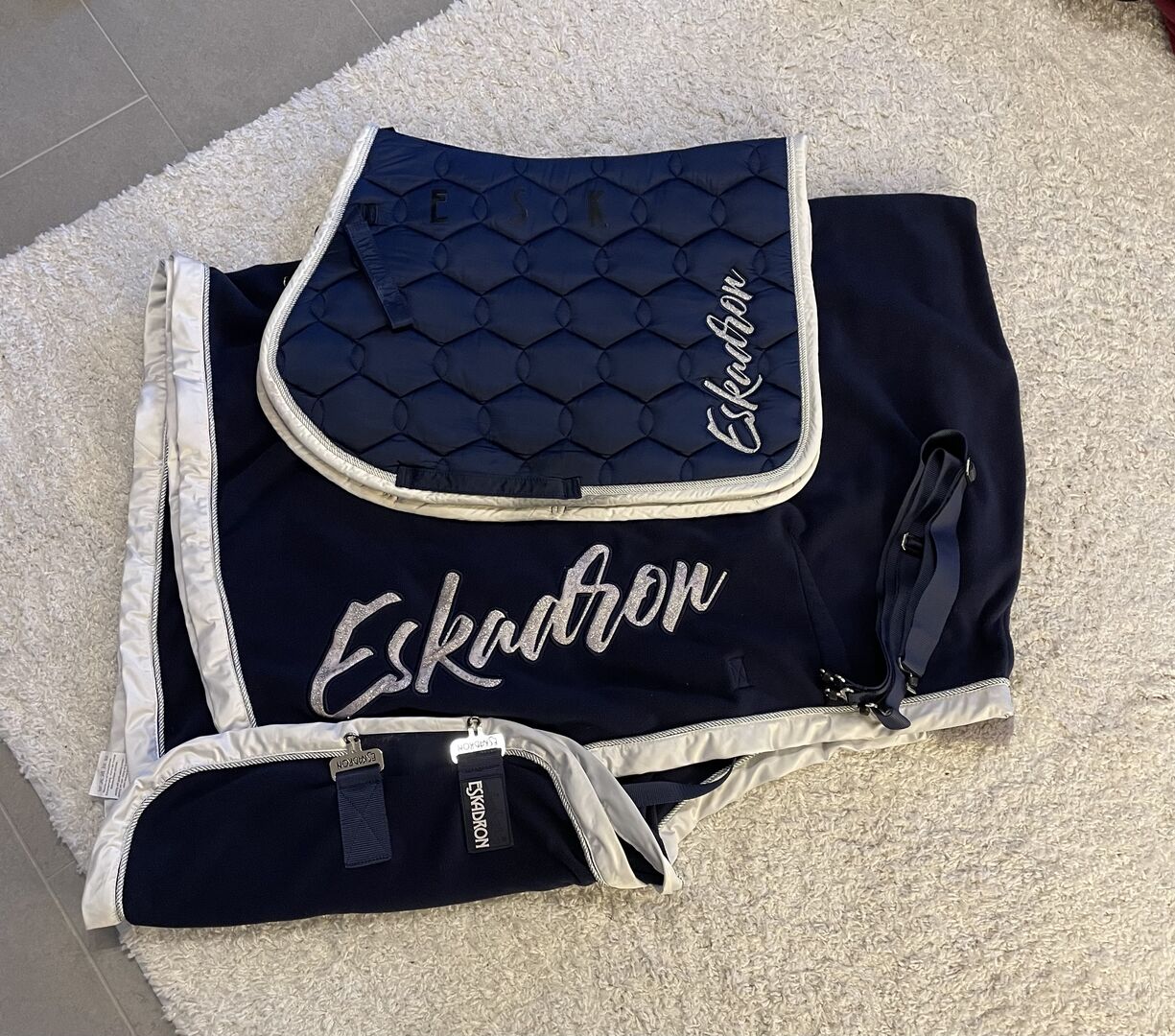 Dunkelblaue Eskadron Schabracke (Schnitt VS) in der Größe Warmblut und Abschwitzdecke in der Größe L (145). Sehr guter Zustand, da kaum benutzt (s. Fotos). Zahlung via Paypal möglich. Keine Garantie, Gewährleistung, Rücknahme, da Privatverkauf.