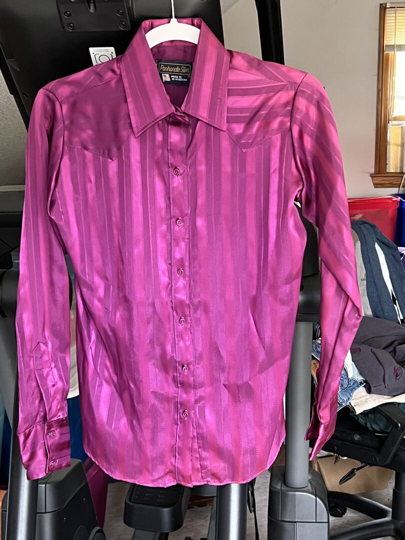 Schönes fuchsiafarbenes Satinhemd. Großartig, um bei der Show zu tragen oder jedes Mal, wenn Sie gut aussehen wollen. Keine Größe Tag aber Maßnahmen als klein.