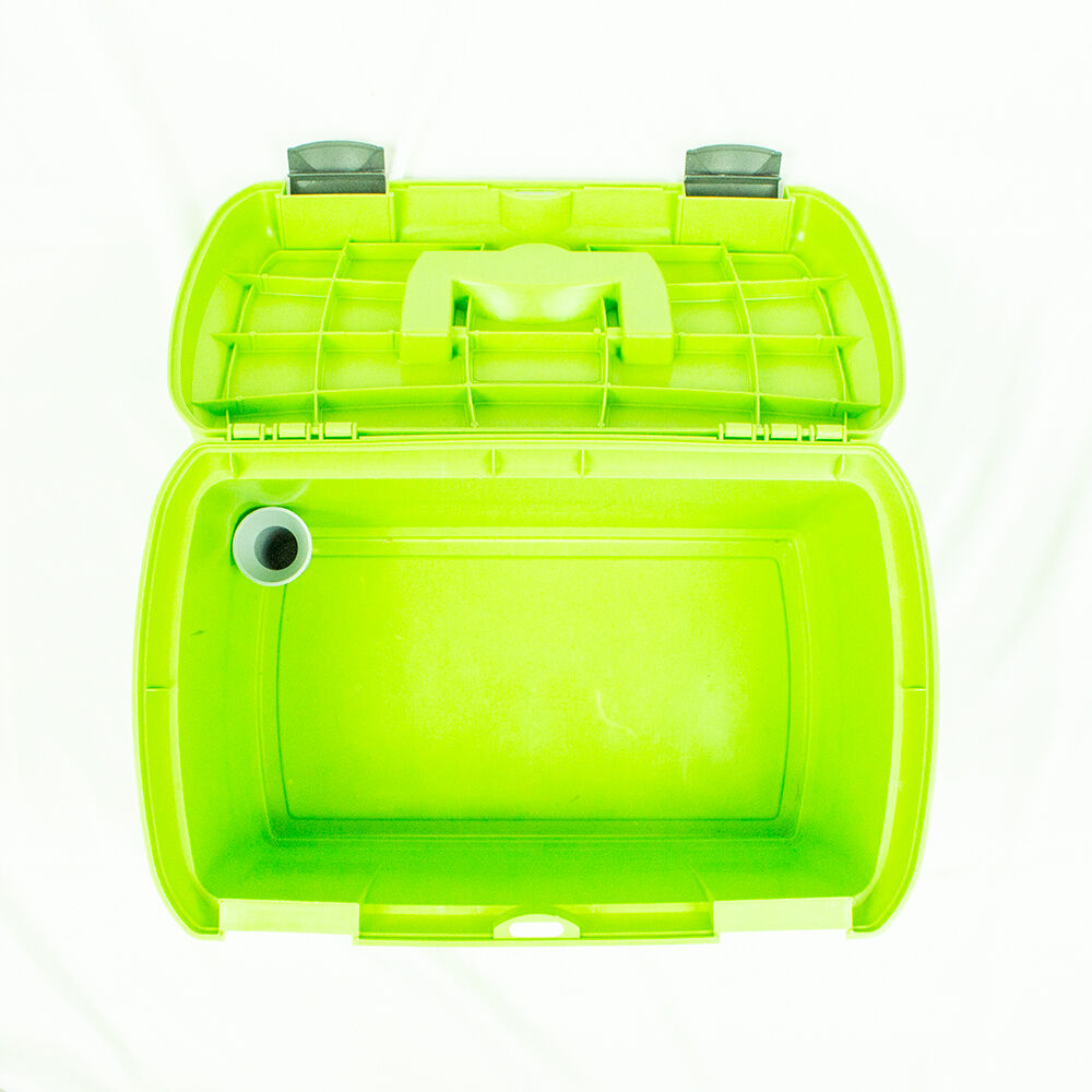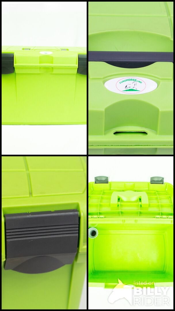 Die praktische Putzbox von Eurohorseline bietet jede Menge Platz und Verstaumöglichkeiten. Perfekt für Bürsten, Pflegemittel und Pflegeutensilien. Er hat einen Einsatz für kleinere Putzutensilien und eine Halterung für Pinsel in grau. Die Farbe weicht etwas von den Bildern ab und ist weniger intensiv. Der grüne Putzkoffer hat nur leichte Gebrauchsspuren und ist in einem sehr guten Zustand.