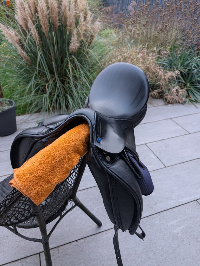 Der Sattel ist vom 8.5.23 und lag sehr wenig auf unserer Stute. Mit im Preis, wären die Steigbügelriemen, Steigbügel, Schoner und der Sattelschoner.